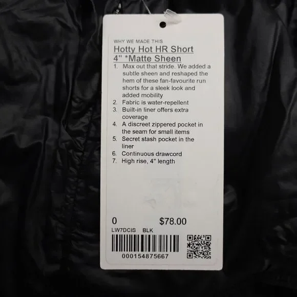 New Lululemon Size 0 Hotty Hot Shorts High Rise HR 4” Matte Sheen Lined BlackWe take our own photos!*Please note color may vary slightly in person due to lighting*Why shop with us?About UsWe have been in business for 7+ years and are trusted sellers with 22,000 sales and counting. Our goal is to provide a good shopping experience and above standard customer service. Please reference our reviews.100% AuthenticAll of our products are purchased from authorized retailers. If you have any questions we are here, just message us.Fast ShippingWe know you want your stuff like yesterday which is why all items are typical shipped within 24 hour of purchase (excluding weekends).Packaging with careYour purchase is just as important to us as it is to you which is why we take extra care to double bag you order to ensure its safe delivery.Read our feedback and buy with confidenceYour feedback is very important to us. It lets us and other potential customers know that you had a positive experience. If there was a problem with your order we are here to help. Please contact us so that we can work to resolve the issue.Stay connectedConsider saving our store by clicking the heart icon under seller information and be the first to know when new items are listed.Thank you for supporting our small business.