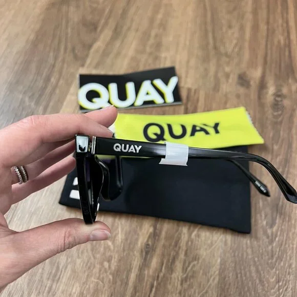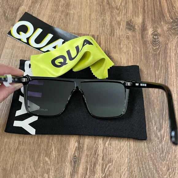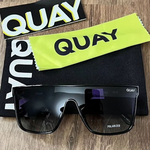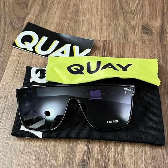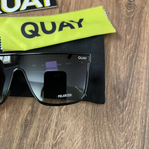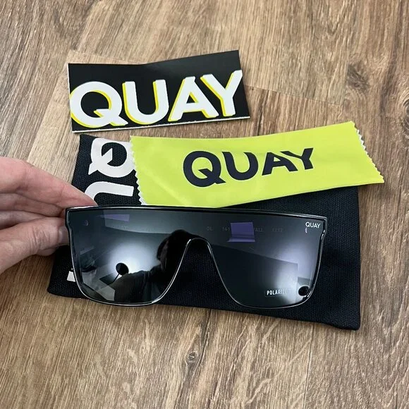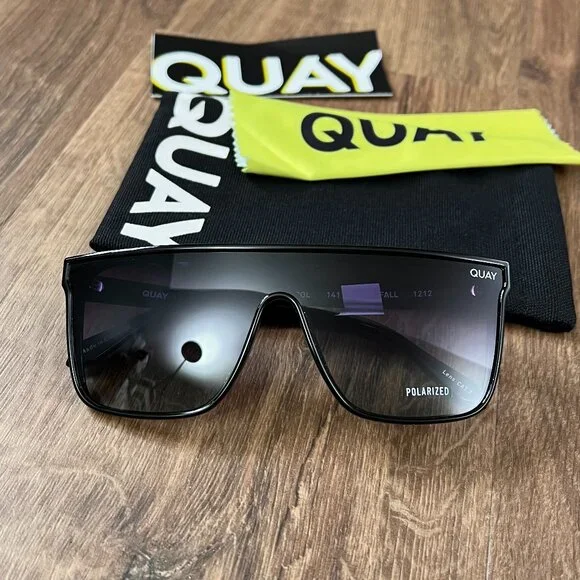 NEW Quay Australia Nightfall Shield Visor Sunglasses Black Polarized LensesThese are crazy fun! Add instant drama to your sunny-day look with these face-shielding sunglasses done with extra-large square lenses. I personally adore this brand and I thought these were fantastic. These feature an oversized flush lens to give you a super modern look for any event, and a minimal frame that’s so light you won’t even feel it.The stock photos are of the Quay Nightfall line to show style on a face . Bonus! These have polarized lenses.Condition: New! These have never been wornCOLOR: black rim with black ombré lenses