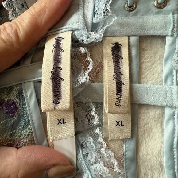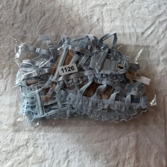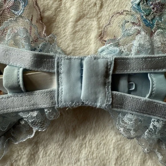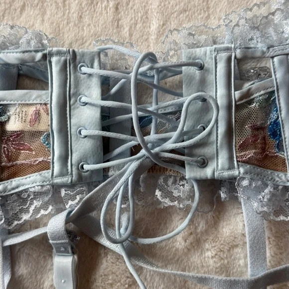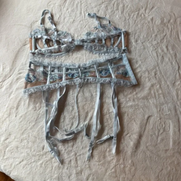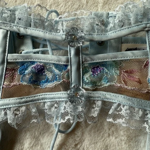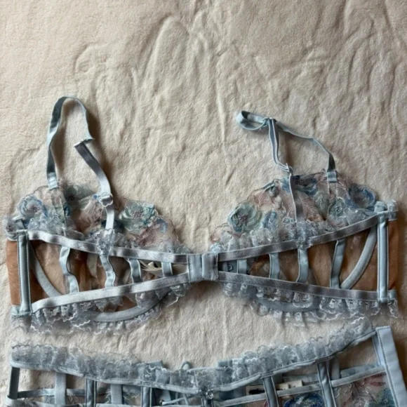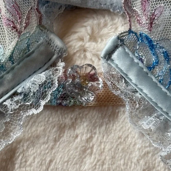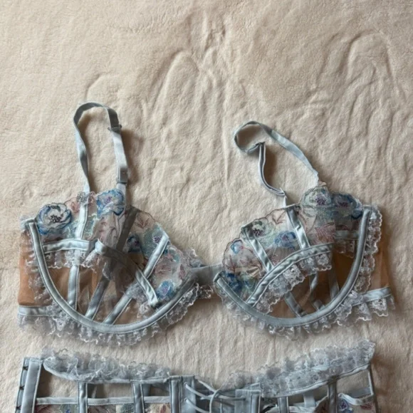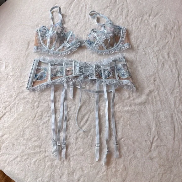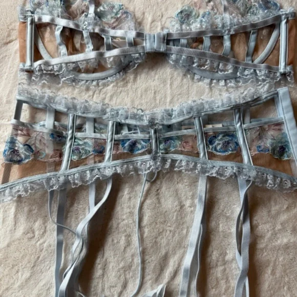 New without tags! Sold as a set! New and matching garter ( no panty ).Bra:The breathtaking gorgeous watercolors and floral embroidery ultra romantic set features a fantasia of amped-up pastels, floral embroidery, and trim. Unlined Underwire Longline silhouette Adjustable straps Back hook-and-eye closure Rickrack trim and ruffle details Garter:A study in gorgeous watercolors and floral embroidery—this ultra romantic thong features strappy accents, peekaboo cutouts, and doily lace details throughout. Finished with crystal flower buttons for extra charm.