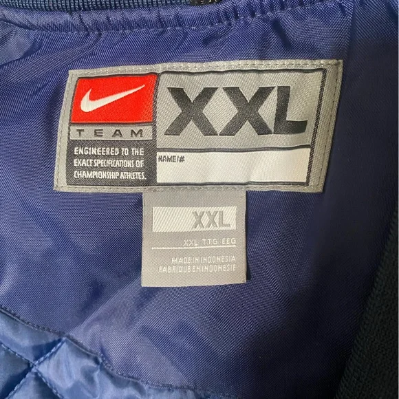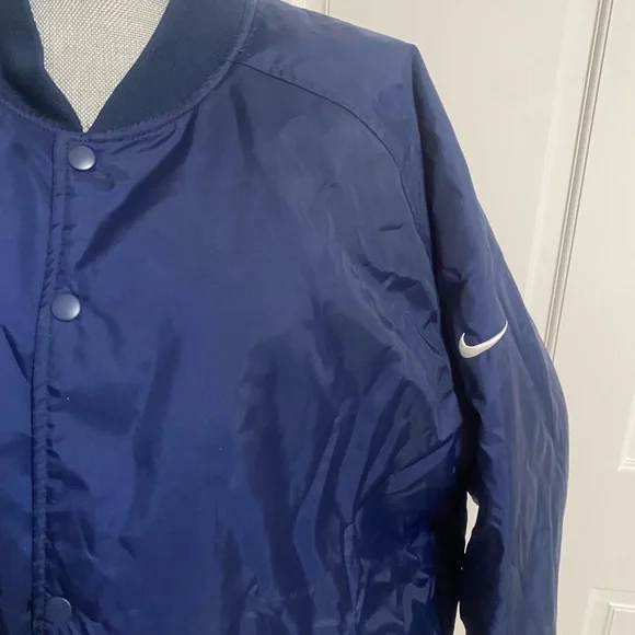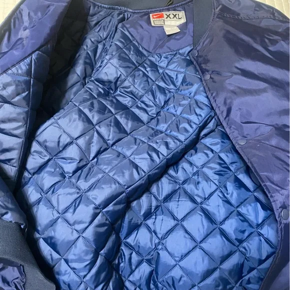 Classic and versatile, this Nike men’s bomber jacket in size XXL is a must-have outerwear piece. Featuring a sleek navy blue nylon shell, quilted lining for extra warmth, and snap button front, it’s perfect for everyday wear, layering, or athletic style.✔️ Size: XXL✔️ Color: Navy Blue✔️ Lightweight yet warm✔️ Quilted interior✔️ Nike Swoosh logo on sleeve✔️ Snap front closure✔️ Ribbed cuffs and hem✔️ Great pre-owned condition — no flaws📏 Flat lay measurements available upon request!🎽 Great for training, casual streetwear, or layering on cool days.🚀 Ships fast from a smoke-free home!