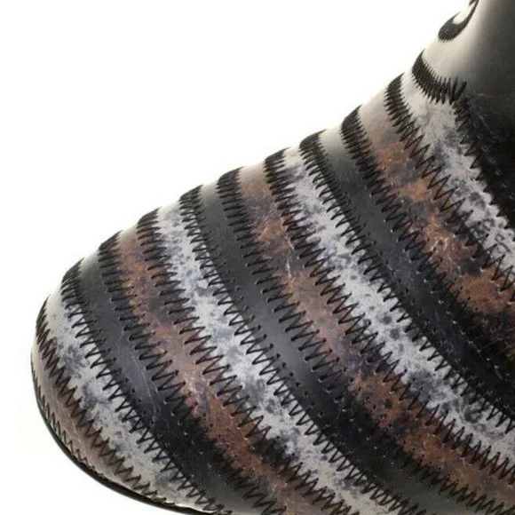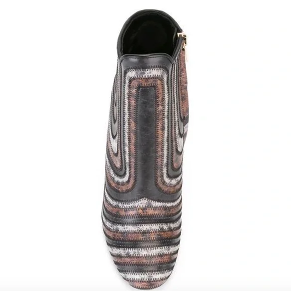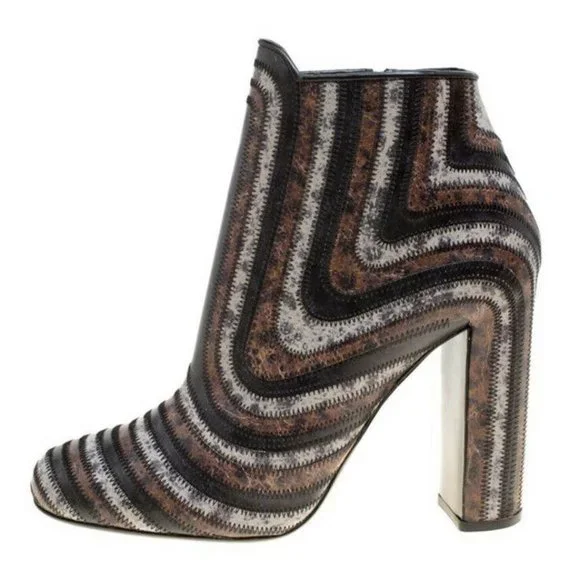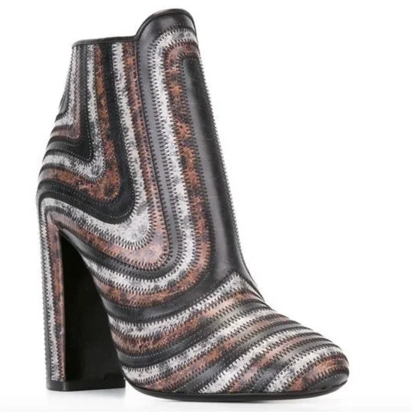 Salvatore Ferragamo Multicolor Leather Feeling Zig Zag Ankle Boots Size 9.5New without original boxMilan Runway 2016Multicoloured leather zig-zag ankle boots from Salvatore Ferragamo featuring a round toe/almond toe, a side zip fastening and a chunky high heel. Leather 100% Leather 100% Leather 100% The graceful architecture of a gorgeous bootie from its round/almond toe to its towering block heel.4" shaft approxSide zip closure.Leather upper, lining and sole.By Salvatore Ferragamo; made in Italy.Customer Service Policy: We are not an expert on everything we sell, so some of our knowledge may be limited. As for shoes and clothing on manufactures overall fit Items are retail store purchases and may have been handled or tried on by store customers Prior to sending, photos are taken of item with shipping label and a zip tie tag attached to represent the item purchased and shipped