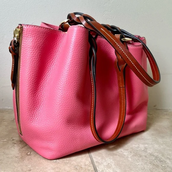 * Italian Saffiano pebbled leather in Bubble Gum * Magnetic snap closure * Handle drop length: 5"* H 9.75" x W 6" x L 12.25" * 2 lbs 4 oz * Designed in Norwalk, CT by Peter Dooney* Two outside magnetic snap pockets, two inside slip pockets, one inside zip pocket * Cell phone pocket, inside key hook* Fully lined with feet* Dust bag available Part of Dooney & Burke bag collection; bundles available!