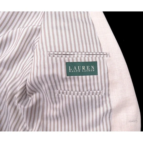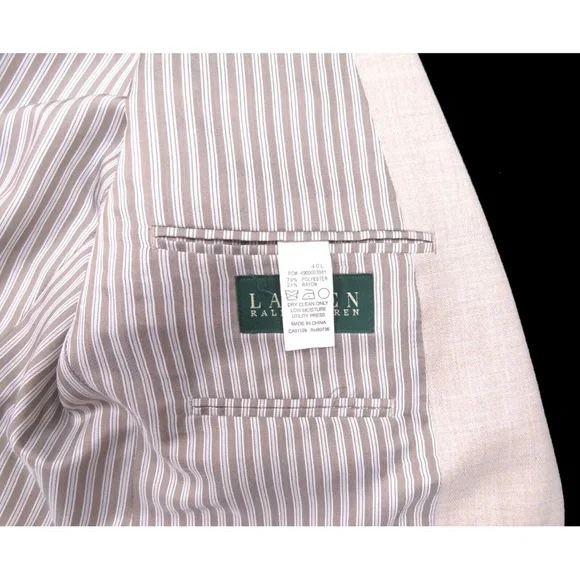 Description: NWOT Lauren Ralph Lauren LRL 2 Button Blazer Sport Coat Jacket -Two button closure -Two front flap pockets-Left chest pocket-Single vented back-Four button cuffs -Notch collarSize (Check Measurements): Mens 40 LColor: BeigeFabric: 76% polyester and 24% rayonCondition: New Without TagsItem#: 66851Measurements are in inchesArmpit to armpit: 22"Back bottom of the collar to the hem: 31 3/4"Shoulder to shoulder: 19"Shoulder seam to end of cuff: 25 1/2"BUYING VINTAGE·We do our best to thoroughly inspect all items for any visible imperfections i.e., rips, repairs, holes, stains, etc. and note as such.·Please note vintage sizes are not always comparable to today's sizing. Please refer to the measurements in the description for a more accurate depiction of the true size. If an issue should arrive, please contact us prior to leaving a negative as we strive for providing excellent customer service.Please compare your measurements to the measurements provided in the listing description to ensure a proper fit. 64340
