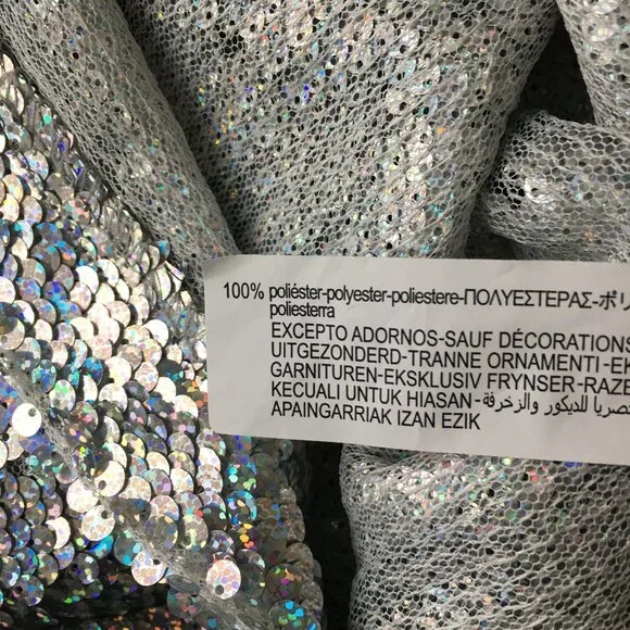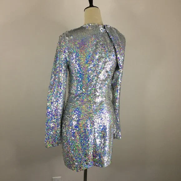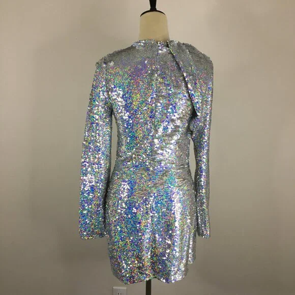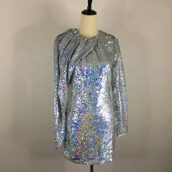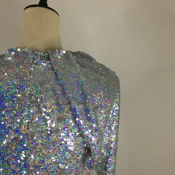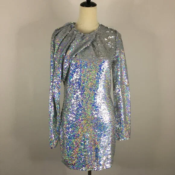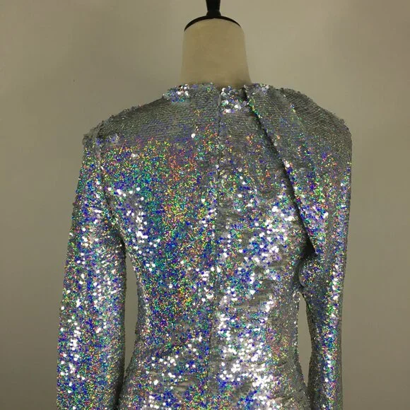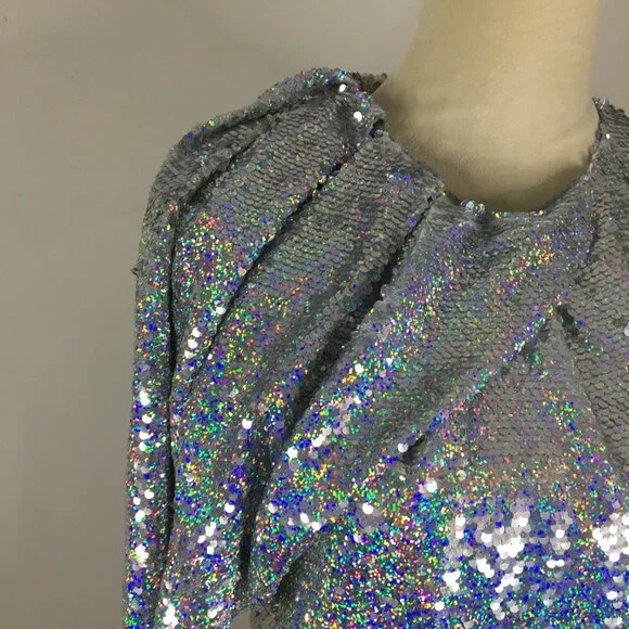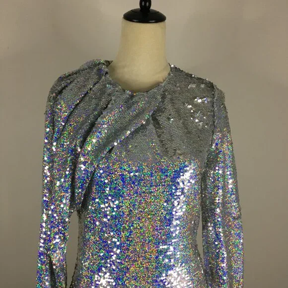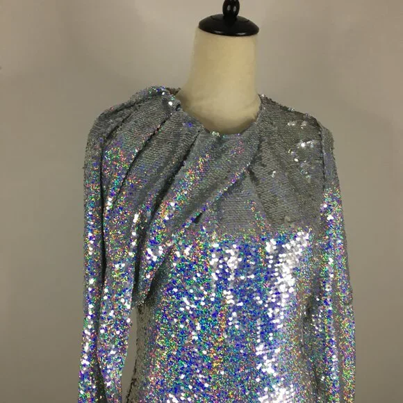 Measurements ( approx. ) one side, while item is laying flat on surface - NOT stretched.Bust (armpit to armpit): 15.5"Sleeve: 25-25.5"Length: 31.5" from top of back.Waist: 14"Hips: 17.5"ADDITIONAL INFO:Some kind of pleats/gathered fabric on one shoulder.Zipper in back.Not lined.Please note that although its silver sequins they do reflect colors, as you can see in the picture.Not a super fitted dress.The fabric has no stretch.New w out tags.FROM PET/SMOKE FREE ENVIRONMENT.THANK YOU FOR SUPPORTING OUR SMALL FAMILY BUSINESS - WE TRULY APPRECIATE YOU!!pmb28c.