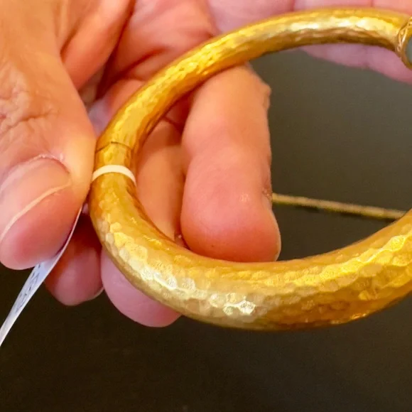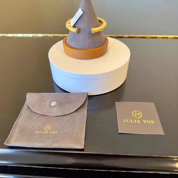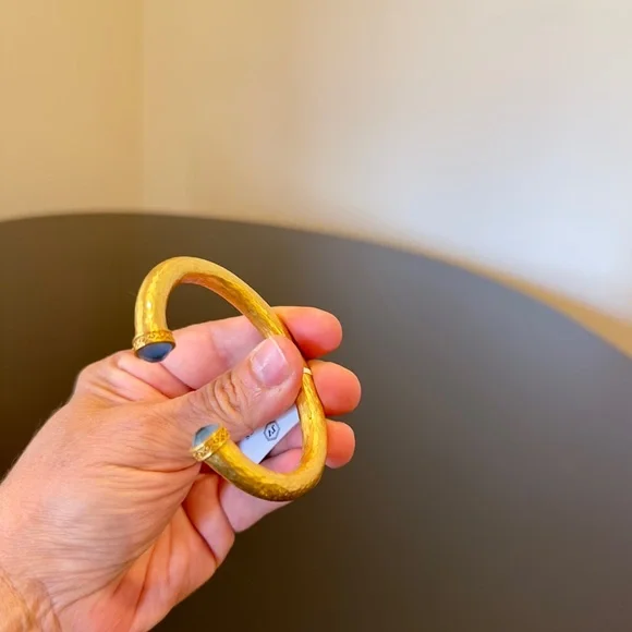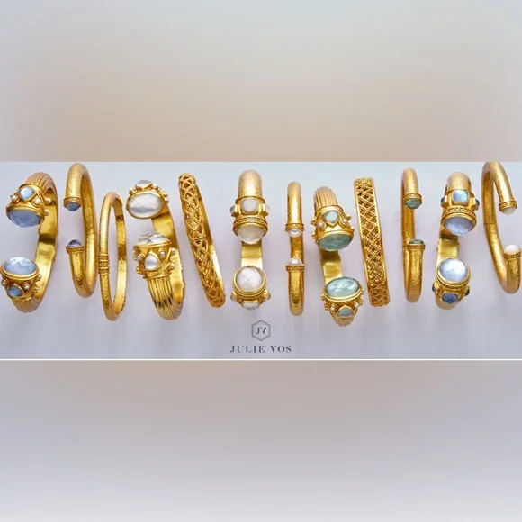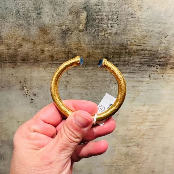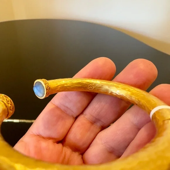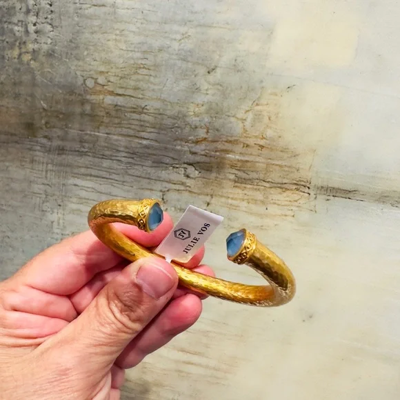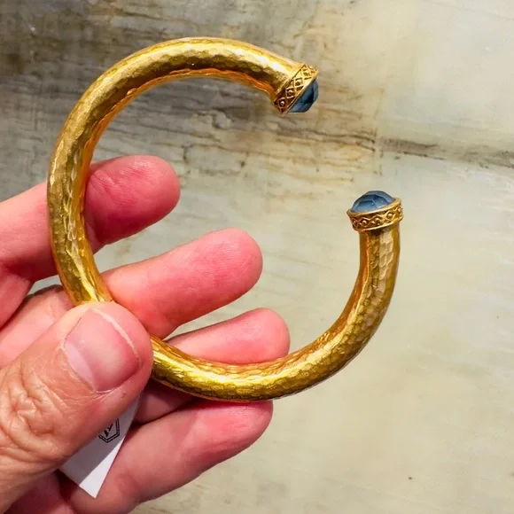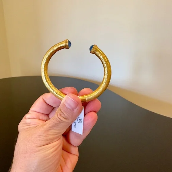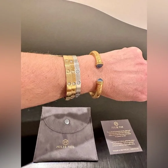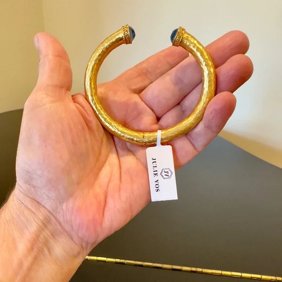 authentic luxury minimalist spring summer Julie Vos Iridescent Charcoal Blue Hinge Cuff/Bracelet-elegant, easy to stack, gilded/hammered finish cuff w/imported faceted rose cut glass gemstones over mother of pearl doublet end caps w/bead-in-diamond detail-Hinged closure,customize fit up to point-sig JV hallmark inside-between 2.25” - 2.5” across inside cuff-endcaps w/stones including metal work between .25” - .5” W-24K gold plate over nickel free brass,sealed to prevent tarnish-can tell from rich color 24K gold plate-JV pieces designed & HANDCRAFTED to standards of fine jewelry, each piece, stone, metal work, plating is unique,stones are hand cut, detail in metal is all hand done, any surface scratches, difference in plating, metal work detail, stones & setting because hand done, tried to show the difference in plating & metal work in pics, pic of tiny spot where plating missed, hand made, how manufactured & purchased-I have pics from many different angles & different lighting to show how stones pick up different hues, beautiful color, substantial weight-original Julie Vos pouch & product info/care card included-included stock pic of other colors & items, I’m selling ONE iridescent Charcoal Blue cuff-please look at pics & video as help describe item-gift w/purchase, will include more than one nice gift with purchase, please check out reviews-SOLD OUT ONLINE & IN STORES, RARE