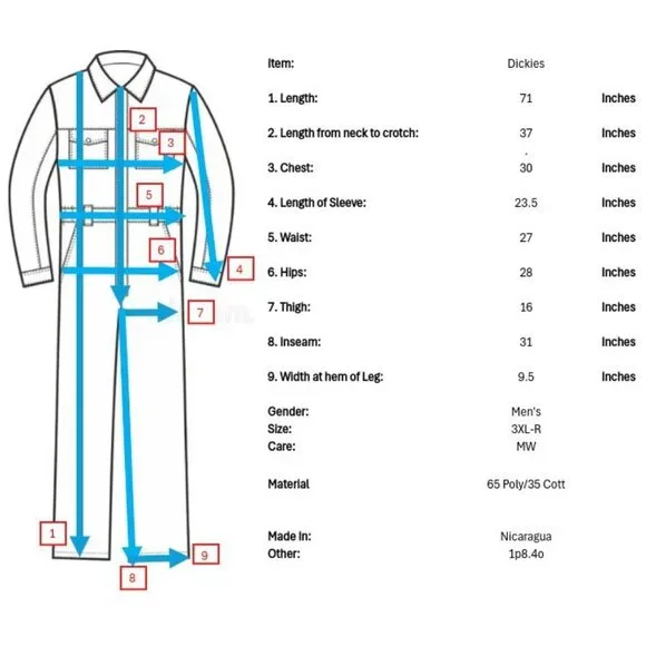 Features:• Brand: Dickies• Type: Outerwear• Style: Coveralls• Line: Dickies Flex• Closure: Zipper• Neck: Collared• Sleeve: Long• Color: Dark Navy Blue• Features: Pockets, Moisture Wicking, Stain Release, Flexible Fabric, Elastic at the Waist• Material: 65% Polyester, 35% Cotton• Size: Men's 3XL R• Condition: NWT, Brand New• Pattern: Solid• Season: Spring, Fall, Winter• Made in Nicaragua• Care: Machine WashMeasurements are Approximate:Length: 71 in / 180 cmLength from neck to crotch: 37 in / 94 cmChest: 30 in / 76 cmSleeve: 23.5 in / 60 cmWaist: 27 in / 69 cmHips: 28 in / 71 cmThigh: 16 in / 41 cmInseam: 31 in / 79 cmWidth at hem of leg: 9.5 in / 24 cmOrders shipped within 1-2 business days.0925074901