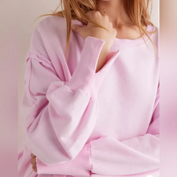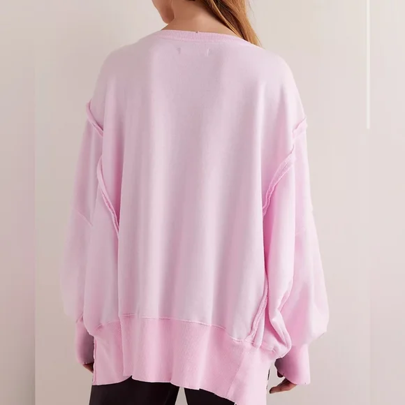 The definition of an effortless essential, this cool and classic pullover is featured in an oversized, slouchy fit with raw, exposed seaming throughout for a true lived-in look.Fit: Oversized, slouchy fit, slightly lower back hemlineFeatures: Soft fabrication, wide scoop neck, exposed seaming throughout, side-slit detailing A need-now wardrobe staple, this sweatshirt is perfect for throwing on and heading out.MEASUREMENTS FOR SIZE SMALL:Bust: 69 inSleeve Length: 15 inLength: 27.25 in48% Cotton52% PolyesterColor: Pink TulleOTHER COLORS AVAILABLE