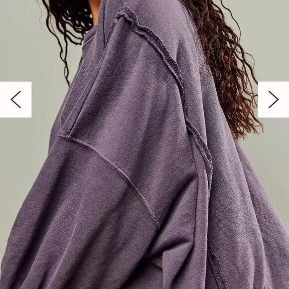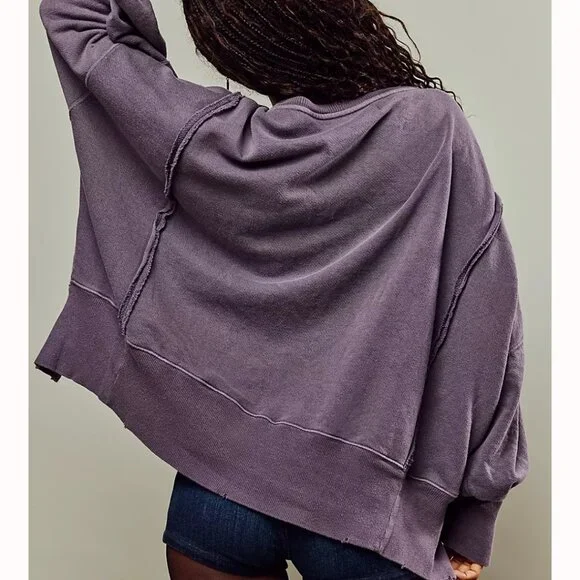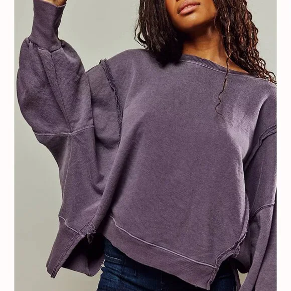 The definition of an effortless essential, this cool and classic pullover is featured in an oversized, slouchy fit with raw, exposed seaming throughout for a true lived-in look.Fit: Oversized, slouchy fit, slightly lower back hemlineFeatures: Soft fabrication, wide scoop neck, exposed seaming throughout, side-slit detailingThis sweatshirt is perfect for throwing on and heading out.Color: Fallen FigMeasurements for size smallBust: 69 inSleeve Length: 27.25 inLength: 15 in