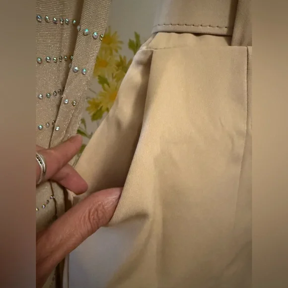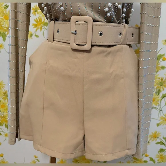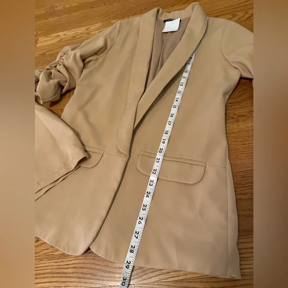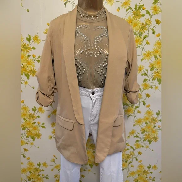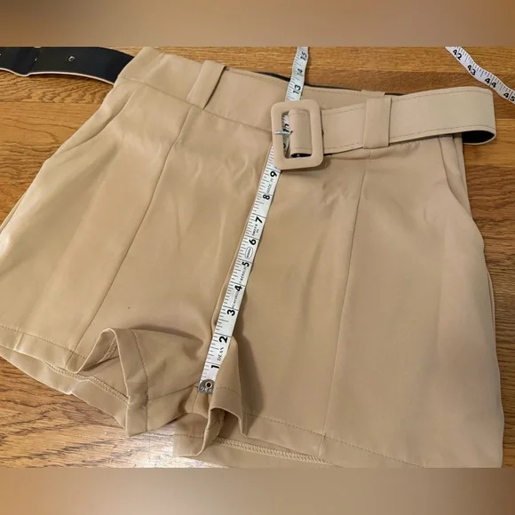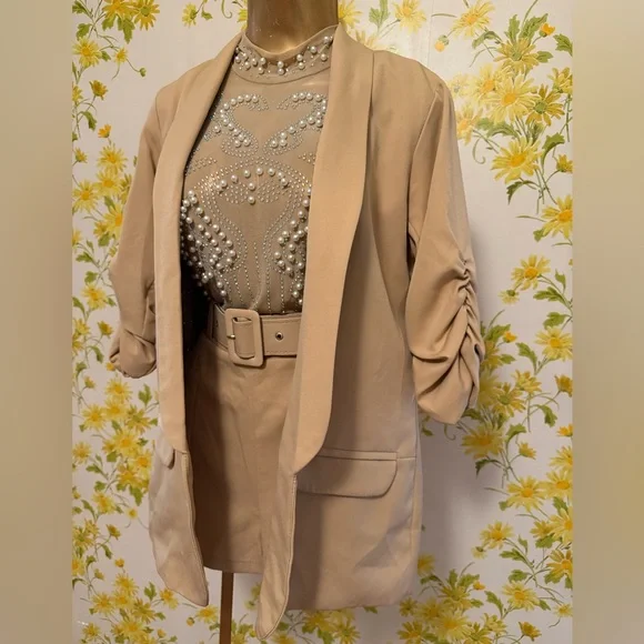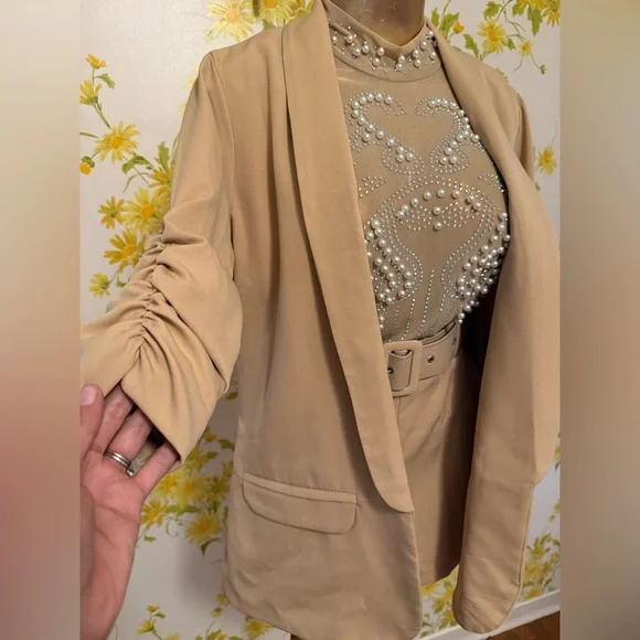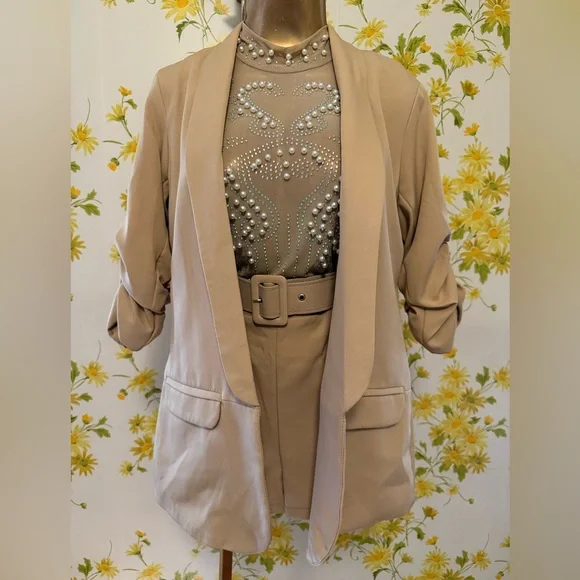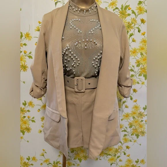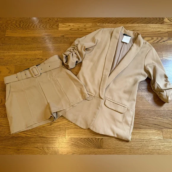 NWOT two piece trouser shorts and 3/4 sleeve blazer,This tan / camel blazer feature an open front, shawl lapel that add a classic touch, while the ruched three-quarter length sleeves offer a casual, summery vibe. Two Piece Outfits Casual camel open Front Blazer Shorts Set. This short suit offer a sleek and contemporary look, perfect for any occasion. Crafted with precision, they feature a modern fit that complements any wardrobe. The neutral tones ensure versatility and style. Belted trouser short with convenient side pockets, side zipper closure, Smoke pets free environment, fast shipping,. *STOCK PHOTOS ONLY FOR STYLE PURPOSE* Size tag is M refer to measurements for a better fit