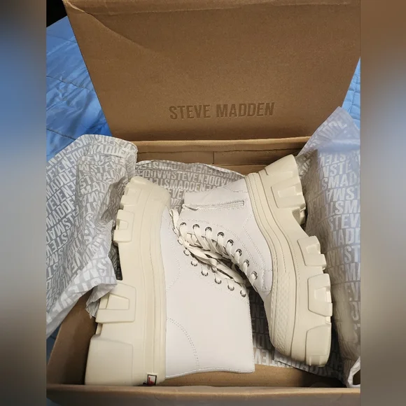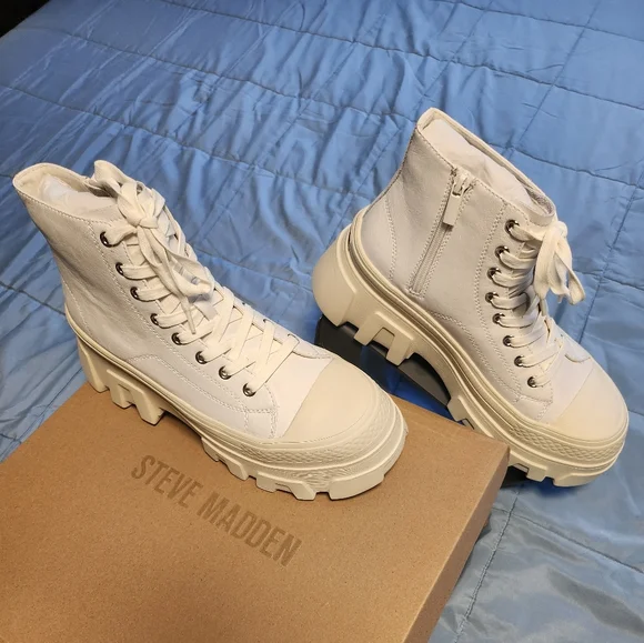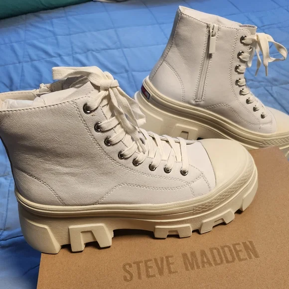 NWT Steve Madden Sutton White Leather Boots Size 9.CUTE + TOUGH + CASUALThe SUTTON bootie silhouette combines the best of a high top sneaker and a combat boot, finished with a sturdy molded platform sole.Lug sole platform combat bootieSide zipper closure with lacing at frontWide molded sole with heavy treads3.25 inch heel height2.25 inch platformLeather upper materialTextile and synthetic liningSynthetic sole