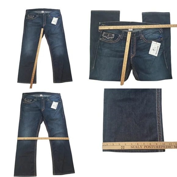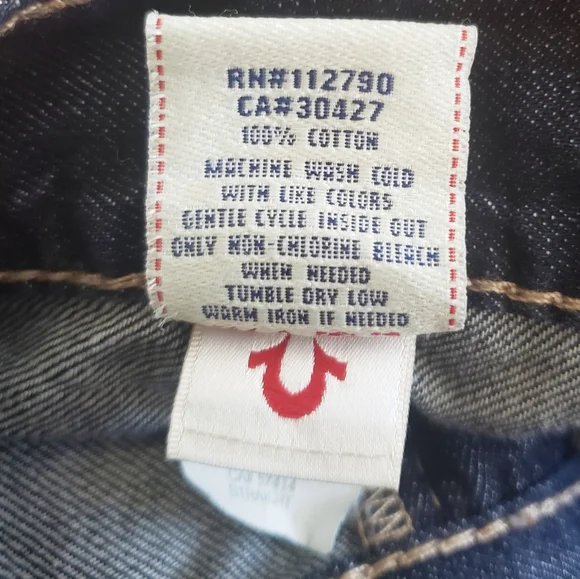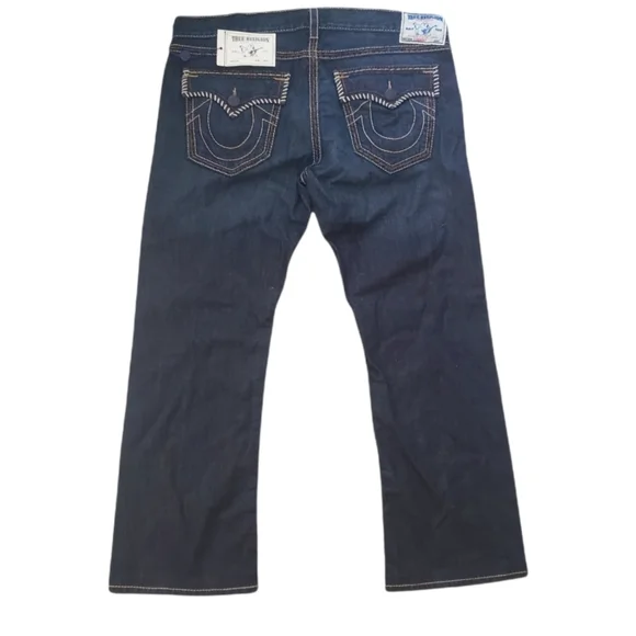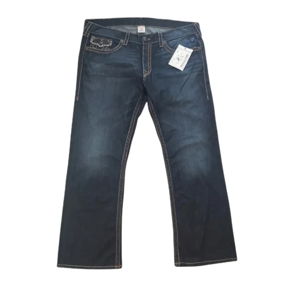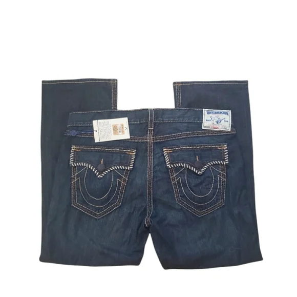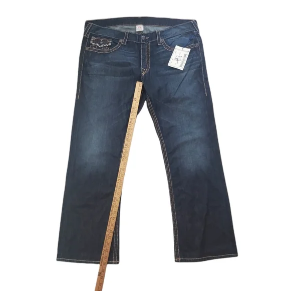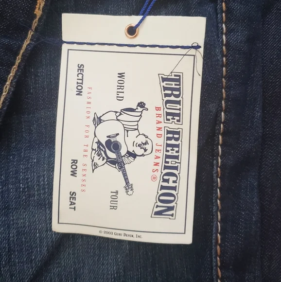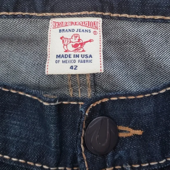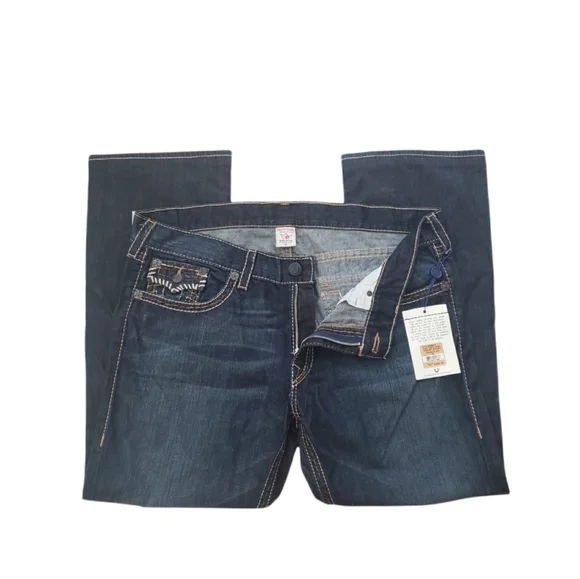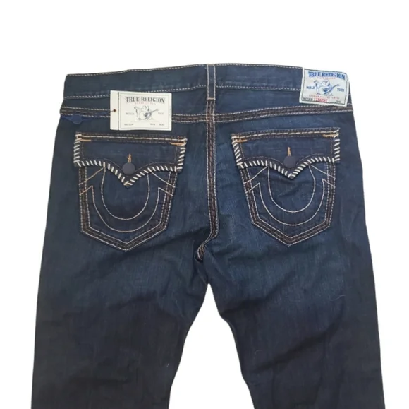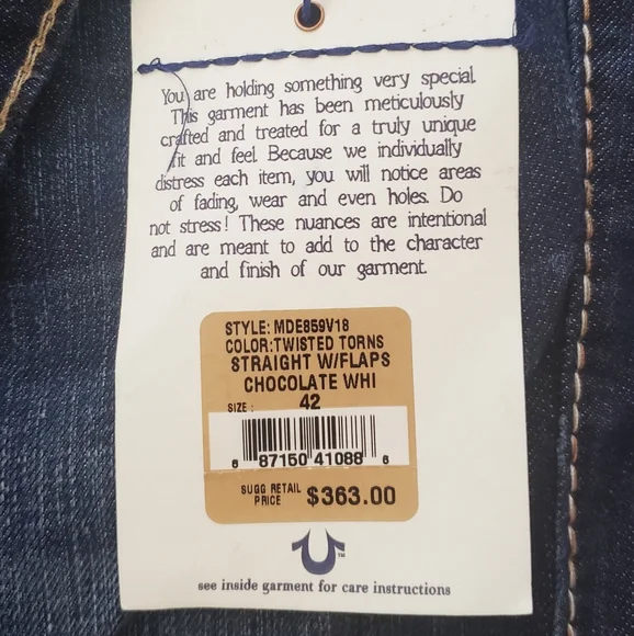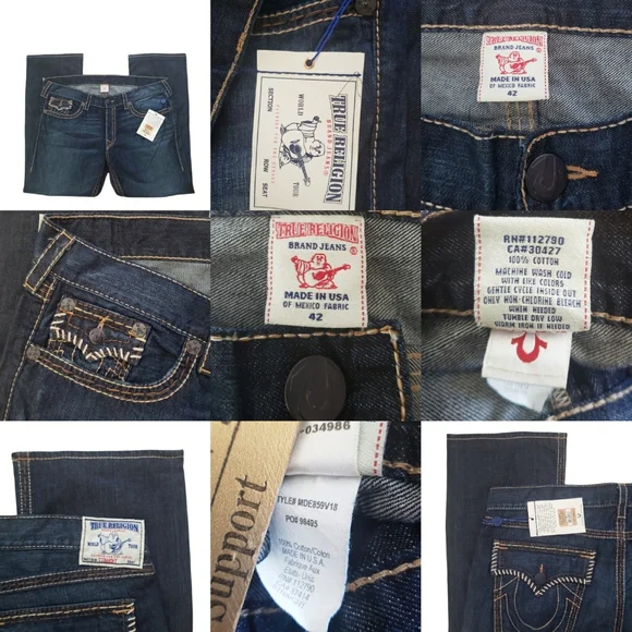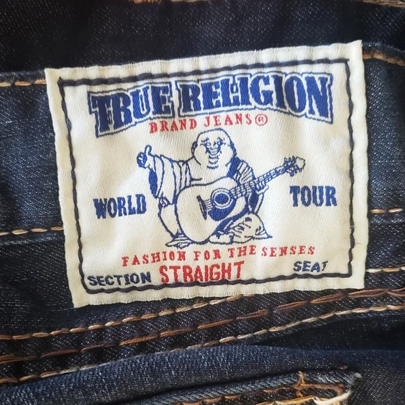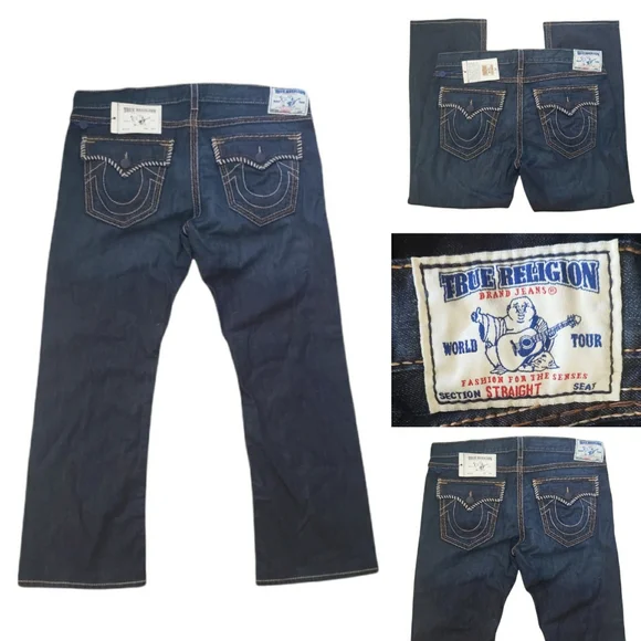 NWT True Religion Twisted Torns Straight W/ Flaps Denim Distressed Jeans Signature Flaps and Large Spellout buttons made in USA Dark blue wash with Chocolate stitched white Stitching New with Tags as pictured. Retail on these is $363. All pictures are of the actual item. The Collage is to show multiple pictures. I Added multiple pictures to show measurements. Don't forget to check out my other Distressed multicolored multicolor colorblock colorful Vintage VTG items for sale. Bundle for deals hip hop rap Exclusive Limited Edition rareSize 42100% Cotton