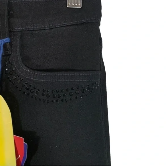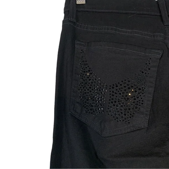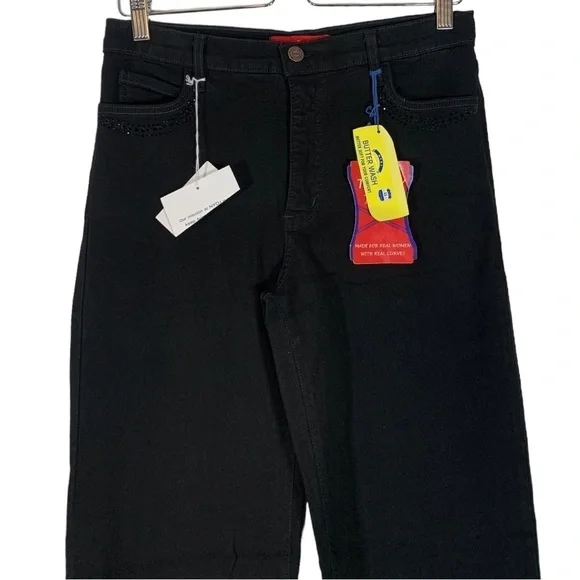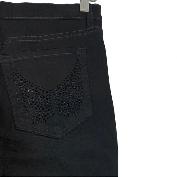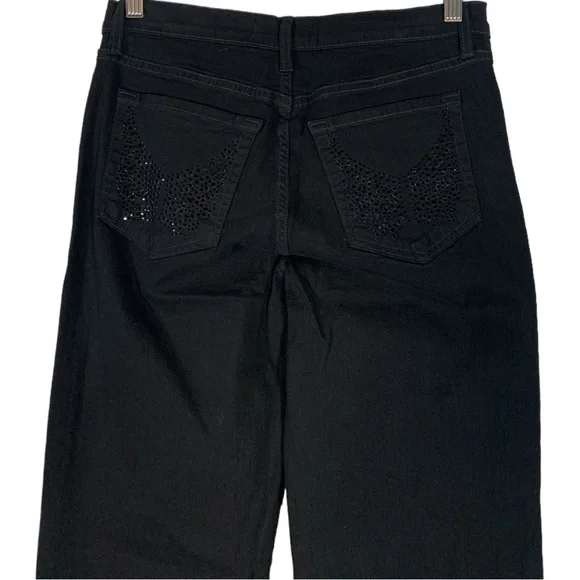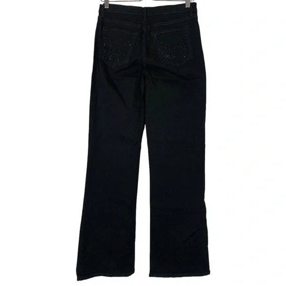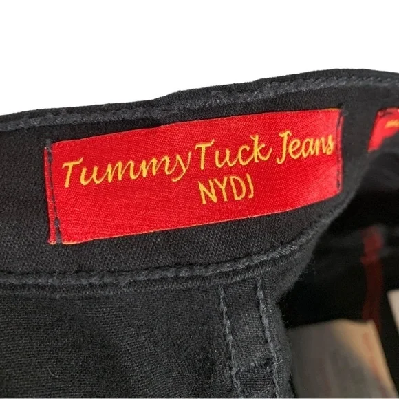 New with tags NYDJ Tummy Tuck Embellished Boot Leg Stretch Denim Jeans Size 6Features: Cotton blend stretch denim fabric in black. Tummy tucking. Matching black embellishments on the front and back pockets. Boot leg leg. Zip to button closure.Approximate flat lay measurements*17" waist*18" hips*12" rise*31" lengthJ206Style tags: stretch, plus size, casual, western, night out, concert