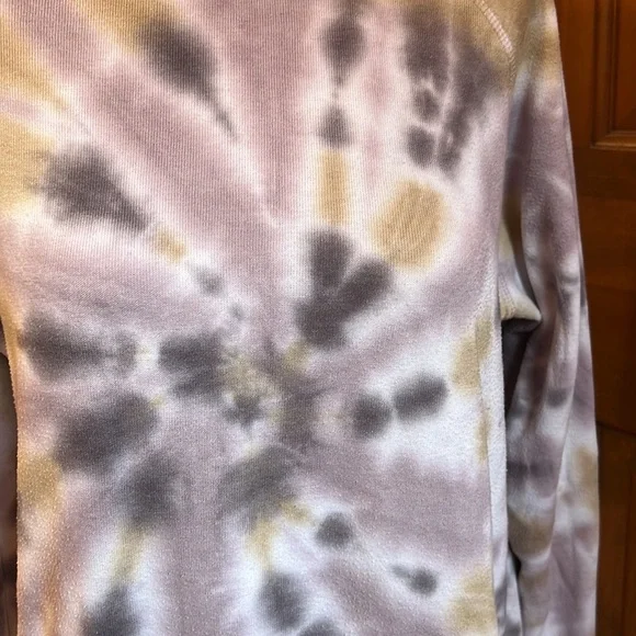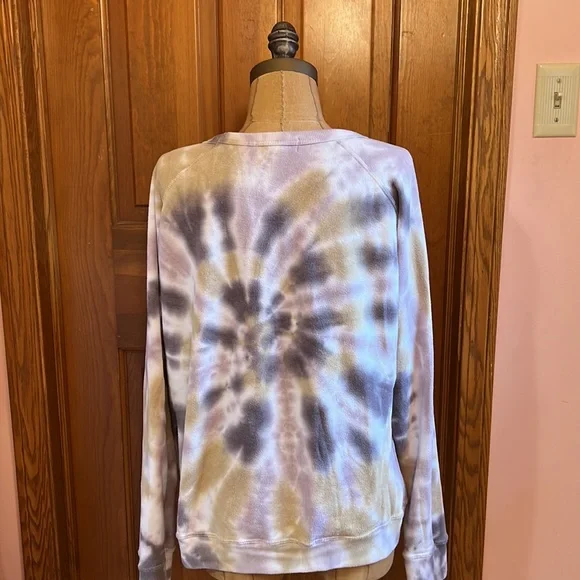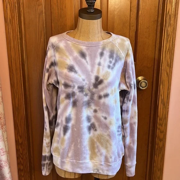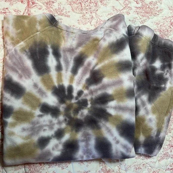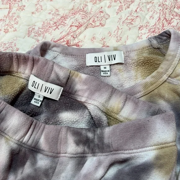 OLI VIV Purple Gold Tie Dye Sweatshirt Size M & Sweatpants Size SOLI VIV Cozy sweat set Sweatshirt size Medium Sweatpants Size small50% polyester 50% Rayon Approximate measurements for sweatshirt Length 24”Pit to pit 18”Pit to wrist 19”Approximate measurements for sweatpants Inseam 27”Rise 10”Waist 13”Small 1” seam repair needed on sweatpants-see photoIsn’t noticeable when wearing Cozy soft sweat set. Fun color pattern. Elasticized waistband on sweatpants. No stains. Pants have cuffs and pockets - See photos for details