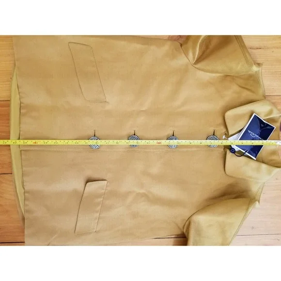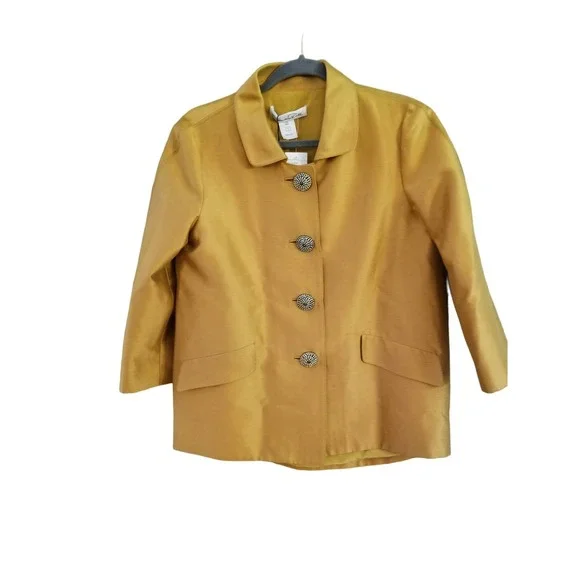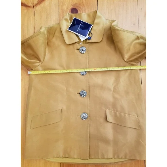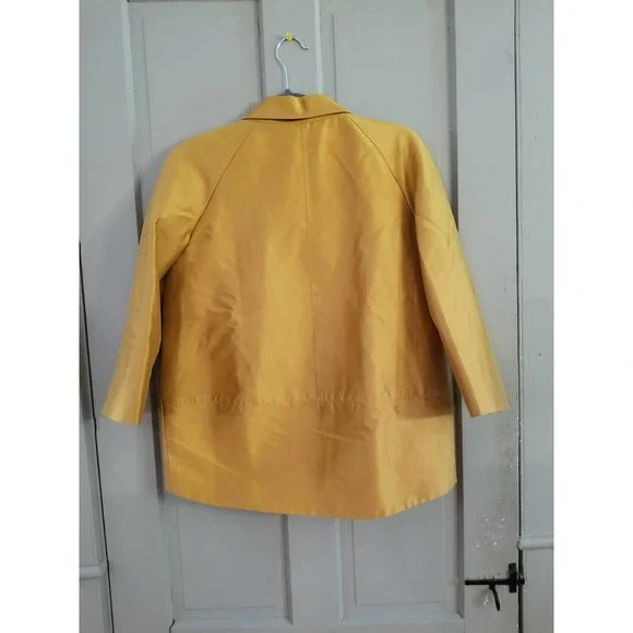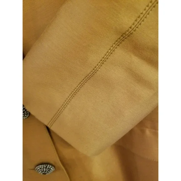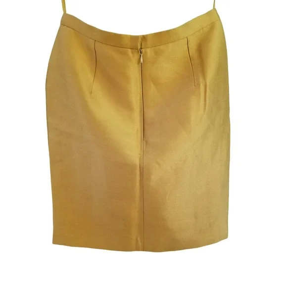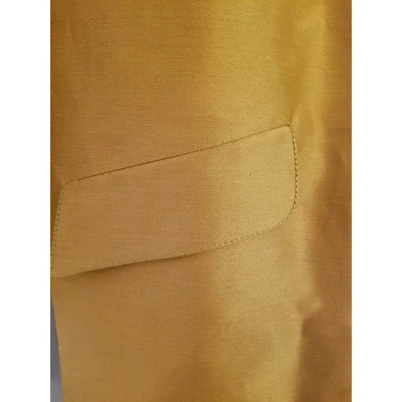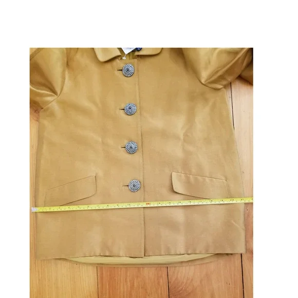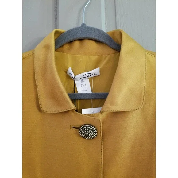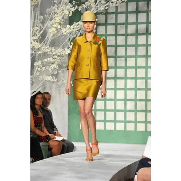 Made in Italy beautifully tailored Oscar de la Renta gold color, cotton silk blend with silk lining, size 8 skirt suit.This suit was featured on the 2009 Resort Runway Show.Final picture is from that show. This suit is absolutely stunning and new with tags and extra replacement button.Please see pictures for measurements.
