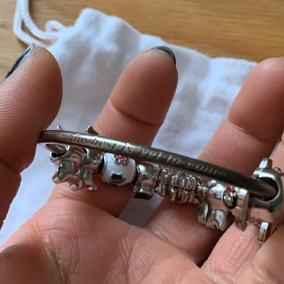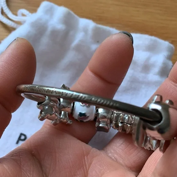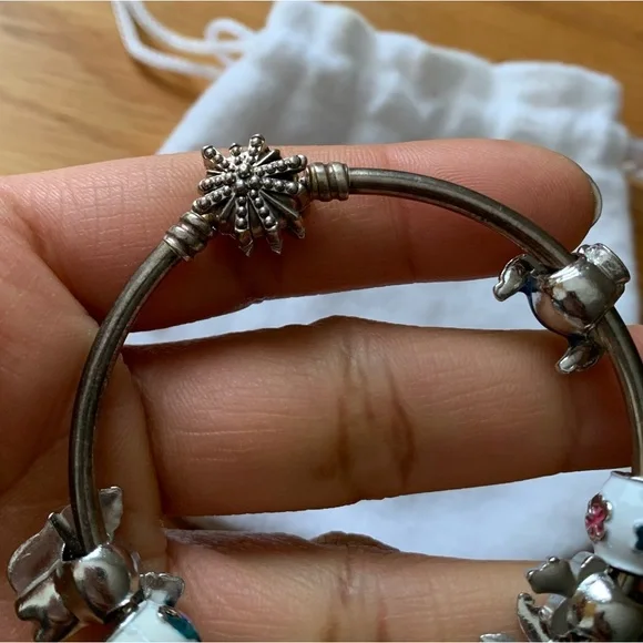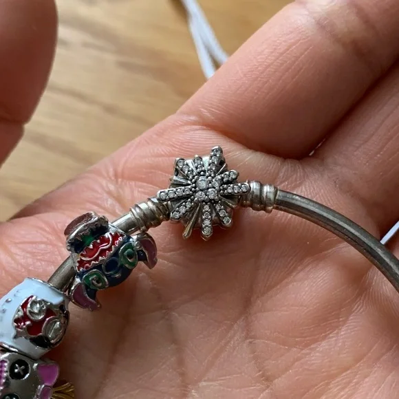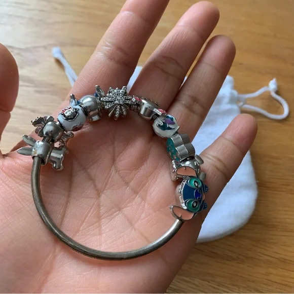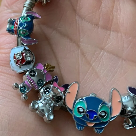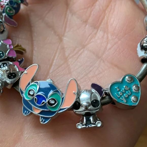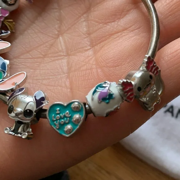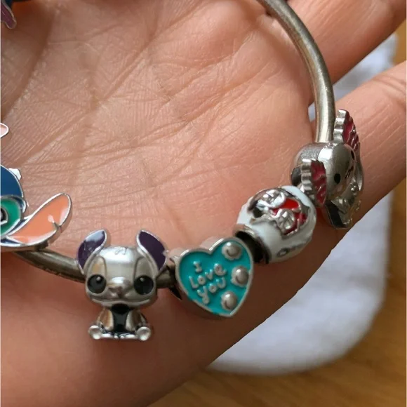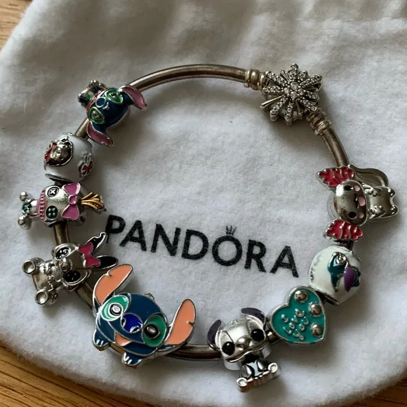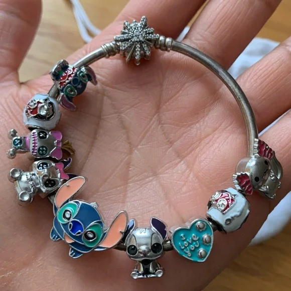 Authentic Pandora Fireworks Bangle Bracelet with 9 NEW Disney Lilo & Stitch Theme CharmsLimited Edition Bangle Bracelets 925 Sterling Silver.Engraving on outside of bracelet say "The best is yetto come"Bracelet is in good condition, some discoloration as shown in photo. Could be clean with silver cleaning. :)Brabelet is authentic Pandora. Charms are European Non Brand Charms, all brand new.You’ll get everything in pictures.Very pretty bracelet set.Perfect for Lilo & Stitch Fan!Perfect for a gift!Cute Disney Stitch Jewelry Cartoon Lilo & Stitch Inspired Bracelet DIY Stitch Pendant Crystal Beads Bangle for Women Jewelry GiftsBracelet is size 17
