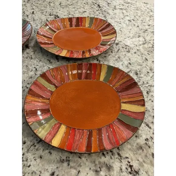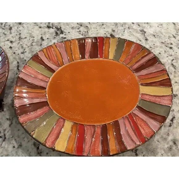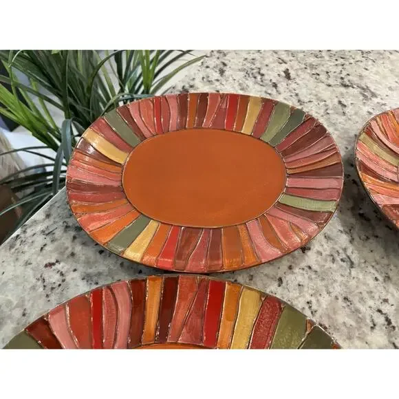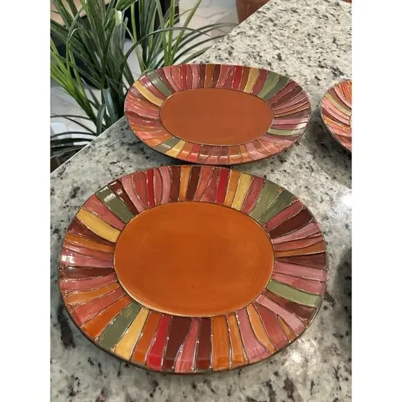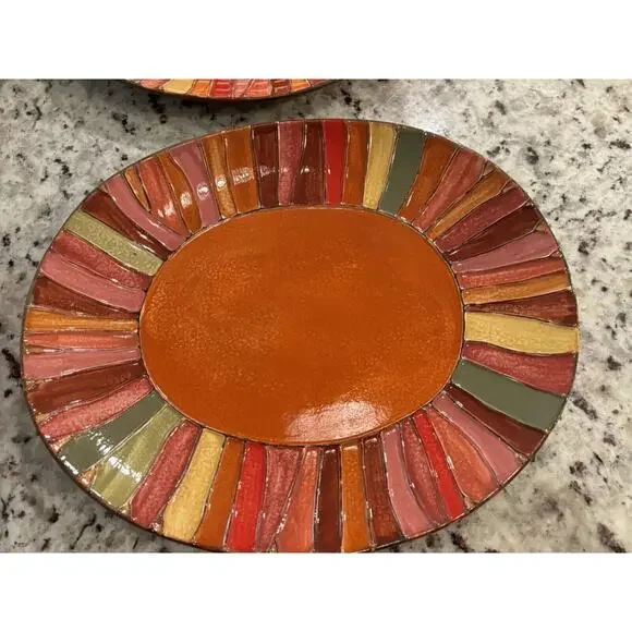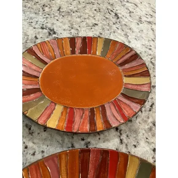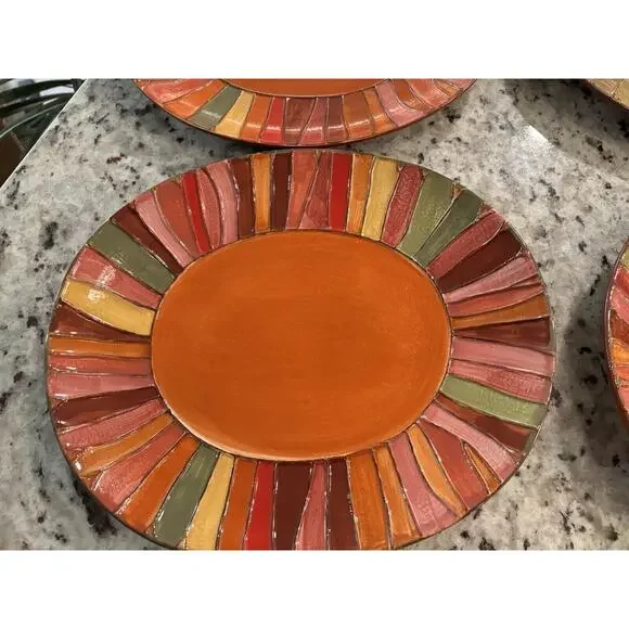 Elevate your dining experience with the Pier 1 Wavy Stripe Dinner Plates, a testament to hand-painted craftsmanship. Each stoneware piece in this four-set features a vibrant, multicolored striped pattern, perfect for adding a splash of color to any table setting. The oval shape and unique design make these plates a striking choice for both casual and formal occasions. Designed with both style and functionality in mind, these dinner plates are dishwasher safe for easy cleanup. The durable stoneware material ensures long-lasting use, while the original Pier 1 brand guarantees authenticity. Whether celebrating a retirement or simply enjoying a meal at home, these plates bring a touch of artistic flair to your dining collection.