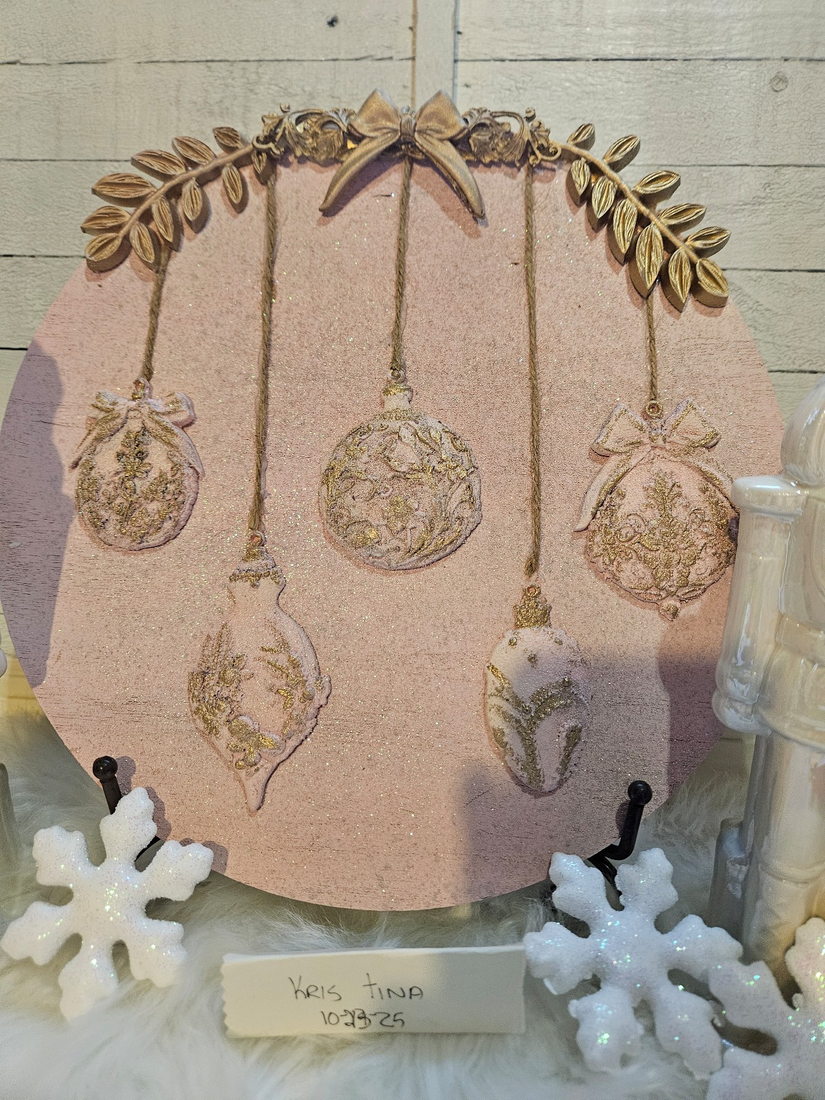 Pinkmas pink themed handmade and painted sparkle ornament board and 2 iridescent nutcrackers