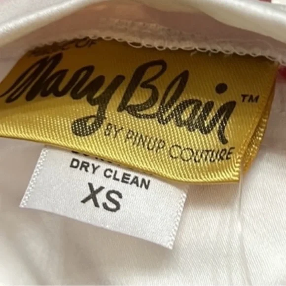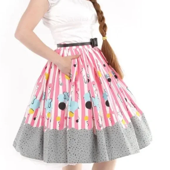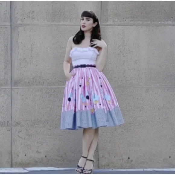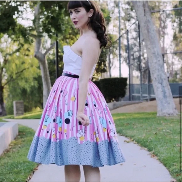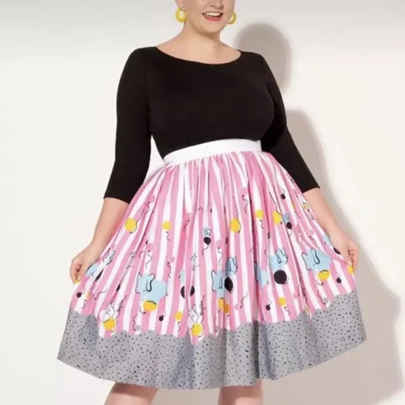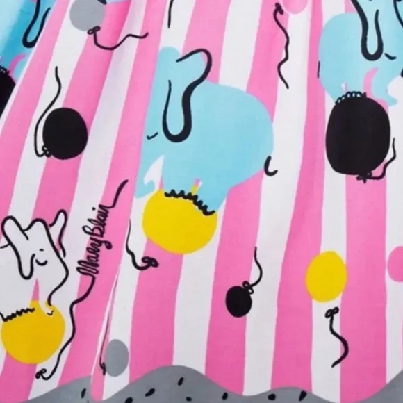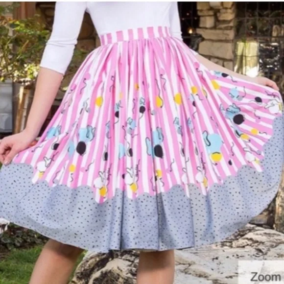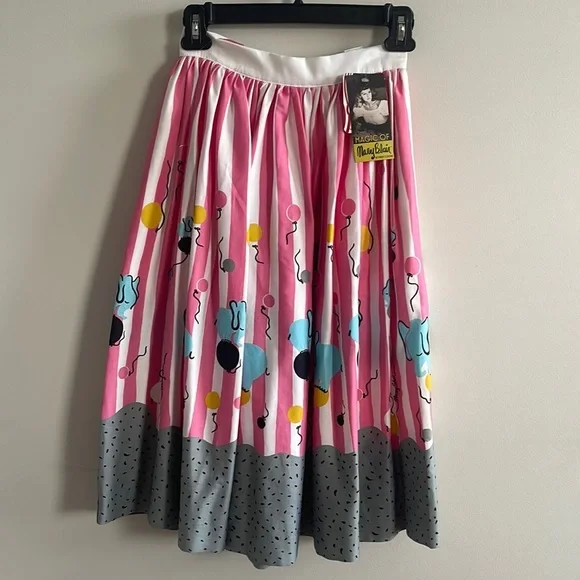 NEW with original tagsMary Blair Pinup Couture Jenny Skirt in Circus ElephantPrint Swing Circle SkirtAll around pleating, wide waist band, zipper back closure Pink and white stripe. Grey print bottom. Blue/yellow elephant circus detail.Size XS Waist approx 11"Length Approx 26 1/2"Hips approx 14"Petticoat not included. Can be worn for a fuller effect