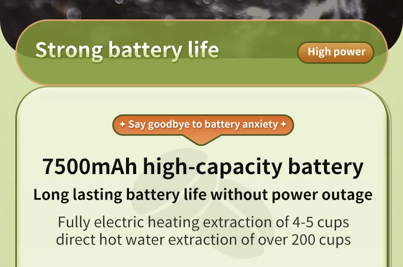 6. Large capacity battery, long-lasting power, heats up for extraction of 4-5 cups, can extract over 200 cups with hot water directly