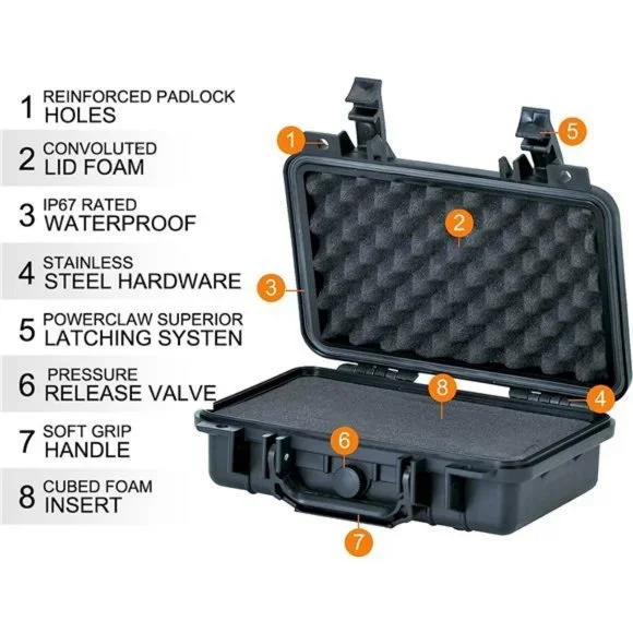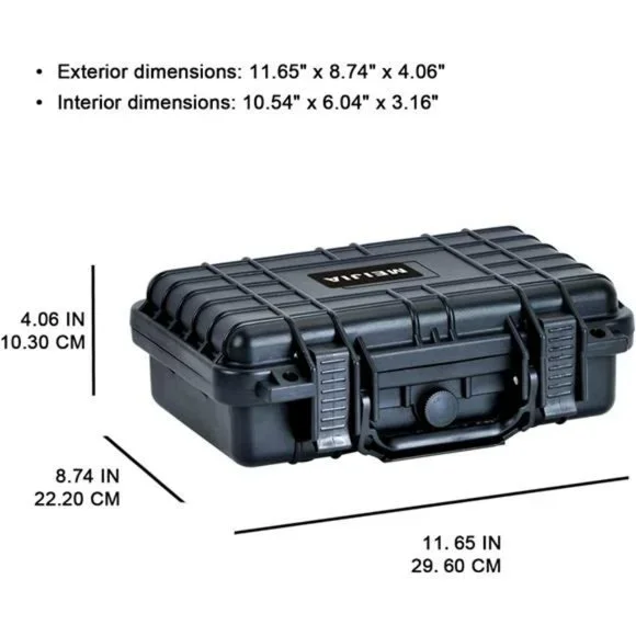 🧿Outside Dimension: Length 11.65inch Width 8.35Inch Height 3.78 inches.Inside Dimension: Length 10.54inches Width 6.04 Inch Height 3.16 Inch.IP67 Rated Waterproof:Keep your valuables dry with its high performance of watertight. Whether you're caught in rain or at sea.🧿Portable Soft Grip Handle:Easy to go with our portable handle design . Beautiful and Functional Injection Molded. Durable use with the solid construction.🧿Easy Open Latches With Reinforced Stainless Steel:Smarter and easier to open compared with traditional cases. Start the release and offers plenty of leverage to open with a light pull in just seconds.🧿High Quality Pressure Valve Included:High quality pressure valve releases built-p air pressure while keeping water molecules out.🧿Customizable Fit Foam Insert: Extremely well padded inside with the ability to cut the foam how you require; by making it to fit a particular object/item keeps them snuggly in place during transport.