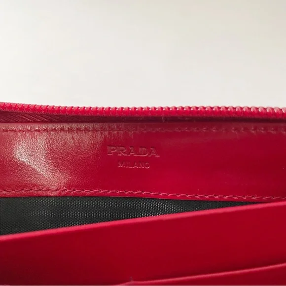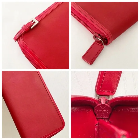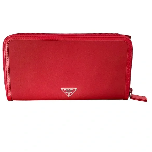 Authentic PradaVintage, circa the late 90sRed Tessuto nylon with red leather trim and buckle detailingTriangle logo on reverse Rare model, with unique leather trim and iconic Prada buckle motifRed leather interiorexcellent condition, some minor scuffs and marks on the nylon with faint tonal variation, but overall nothing noticeable or distractingThe leather is in excellent condition 7.5 x 4 x 1 inches
