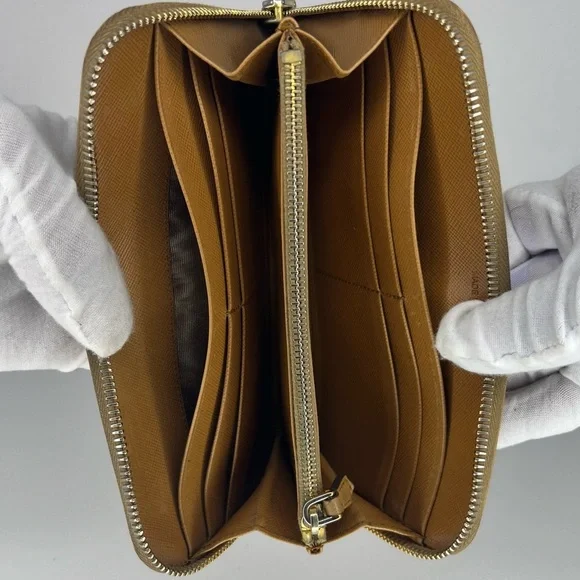 Used condition! Normal wear and tear!! Sewn beautifully using Saffiano Lux leather, this Prada wallet stands for resistance and durability.Luxe and compact, the wallet features a well-equipped interior and gold-tone hardware. It is surely going to accompany your days with ease.Length: 19 cmWidth: 2 cmHeight: 10.5 cmHardware: Gold ToneExterior Material: LeatherInterior Material: Leather And FabricThis item is pre-loved. Before purchasing, please refer to the images for the exact condition of the item.We provide a 100% GUARANTEE that all items in our closet are authentic. If for any reason you are not satisfied with the authenticity of your purchase, we will provide a full refund.We are open to offers!* All issues will be clearly pointed out to the best of my ability in the description and photographs. I AM NOT A PROFESSIONAL PHOTOGRAPHER and WILL PROVIDE A VIDEO UPON REQUEST.• NOTE: If the item includes a dust bag or the original box it will be clearly stated in thedescription....Otherwise it will NOT be included.SMOKE FREE HOME!! 💯% AUTHENTIC!!