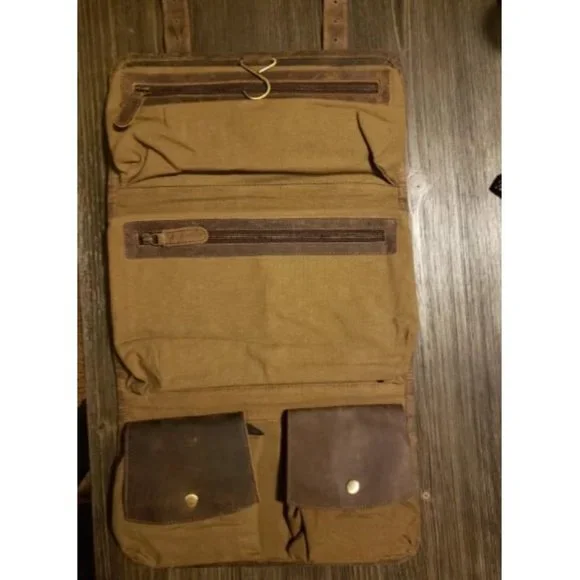 *Made from the finest Full grain buffalo leather and handcrafted by experienced craftsmen*High end canvas lining on the outside and water resistant inside lining inside all pockets . Top quality YKK metal Zippers for rich classy look and durability.*Sleek vintage inspired design , Can be used as a hanging toiletry bag or a flat lying one. 4 Internal pockets ( 2 zippered and 2 with snaps lined with water resistant material) which can hold a lot of your travel accessories. . Grab handle for easy carry. Real buckles for secure closure and vintage look .*Measures 12 inch width x 7 inch height when folded and 12 inches x 21 inches when unfolded*A must have for all travellers and an ideal gift for your family and friends ,This toiletry bag is a great and classy way to store your toiletries.*Made from the finest Full grain buffalo leather and handcrafted by experienced craftsmen*High end canvas lining on the outside and water resistant inside lining inside all pockets .