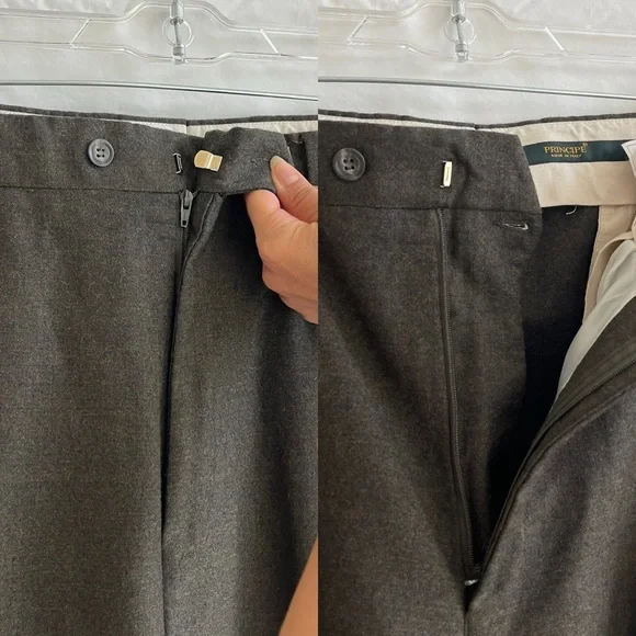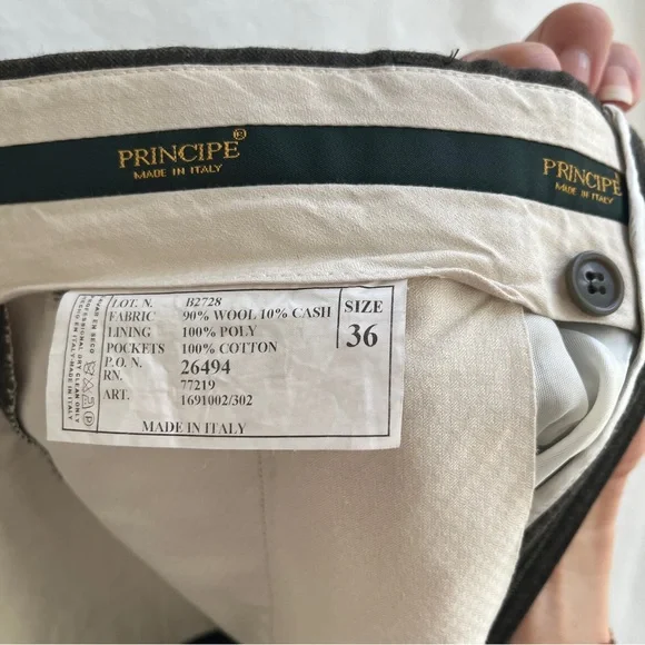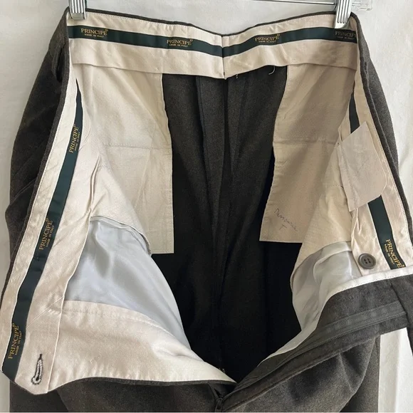 Principe Men's brown wool and cashmere fabric, made in Italy, size IT 36/ US 36WCondition: Great vintage, Gently Used. No Odors, Stains or Holes. It has a handwritten marking inside on one of the pockets shown in the pictures. This does not affect the integrity or the quality of the piece. As Is.Approx. Measurements Flat Across:*Waist: 18-1/2"*Rise: 12-3/4”*Inseam: 30-1/2”Please refer to pictures for more details.*bag#10