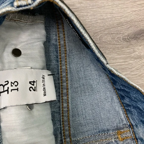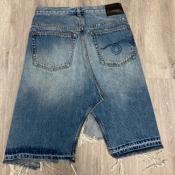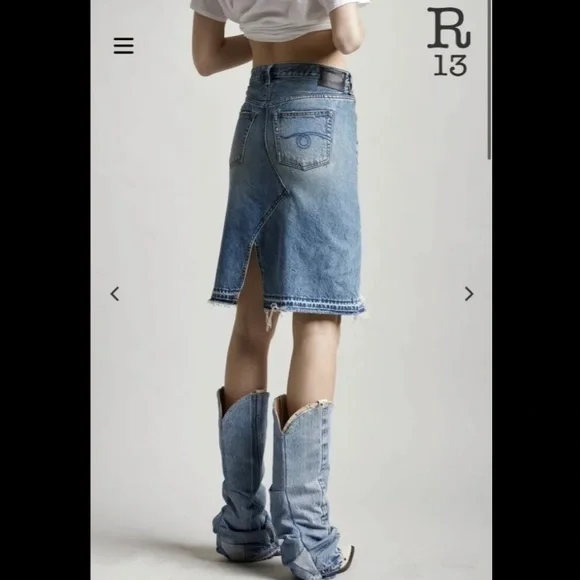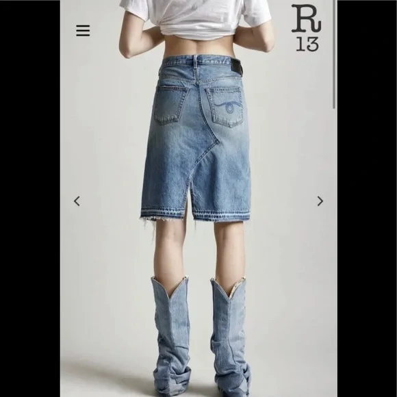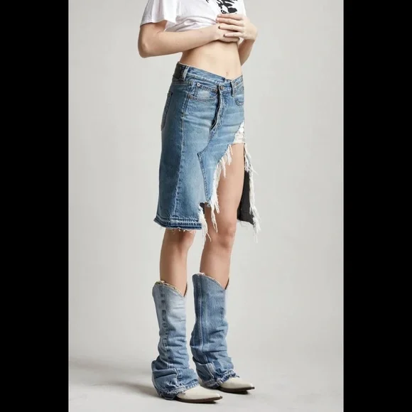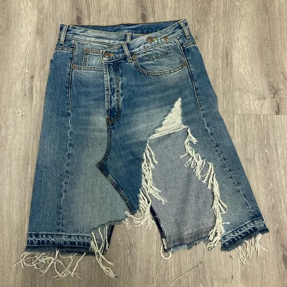 R13 NORBURY DENIM SKIRT - JASPER. Crossover denim skirt with shredded slit up the frontNew with out tags.Size 24R13's 'Norbury' skirt is enough to bring out your animal instincts. It's made from leopard-print denim and is frayed along the spliced front to reveal a little extra skin. Go wild. Featuring a high rise, an asymmetric hem, a five pocket design and a distressed finish.Fabric: Mid-weight stretch denimDistressedCrossover button waistButton flySlant hip and patch back pocketsShell: 100% cottonWash coldMade in ItalyR13's knack for grown-up grunge shines through once again with this leopard-print skirt, which features the label's characteristic off-kilter waist and edgy distressing. The best pair of shoes for this piece? Your trusty combat boots, of course.