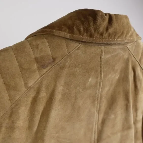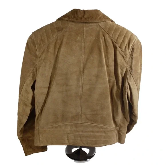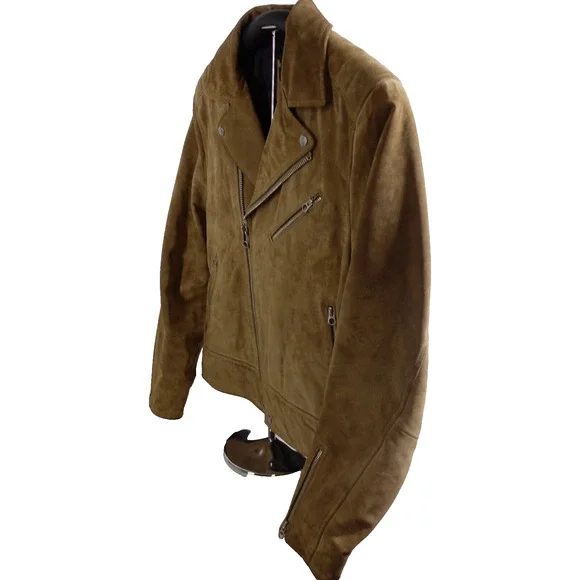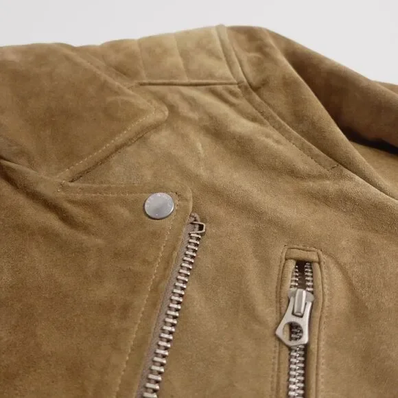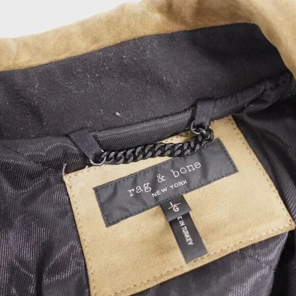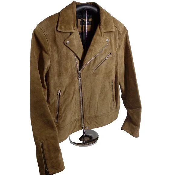 Rag & BoneSuede Lamb Leather Motorcycle Jacket - Sahara Brown,Size LargePre-OwnedElevate your wardrobe with the timeless sophistication of Rag & Bone's Motorcycle Jacket. The exquisite Sahara Brown suede is crafted from the finest lamb leather, offering an unparalleled fusion of luxury and edgy style. Accented with striking silver hardware, this jacket is tailored for those who appreciate fine craftsmanship and iconic design.Product Details:- Brand: Rag & Bone- Type: Motorcycle Jacket- Material: Suede Lamb Leather- Color: Sahara Brown- Size: Large- Hardware: SilverKey Measurements:- Shoulder to shoulder: 19"- Chest (armpit to armpit): 20.5"- Sleeve length: 18.5"- Overall length: 25.5"Condition:- The jacket is in excellent pre-owned condition, with minimal signs of wear.- All zippers and closures function smoothly.-There is a small mark of the right shoulder- Leather remains supple and rich in tone, indicative of its premium quality and care.- Detailed images are attached for a comprehensive view of the jacket's condition.Return Policy:SKU# BS02By purchasing, you agree to our returns policy. Items must be sent back in the same condition as received: unworn, unwashed, with any original tags attached. Returns deviating from these guidelines are not eligible for refunds.Don't miss the chance to make a statement with this Rag & Bone Suede Lamb Leather Motorcycle Jacket. It's not just a piece of clothing; it's an investment in style.
