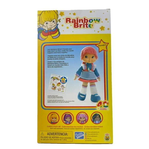 Rainbow Brite MOONGOW 12" Doll & Stickers Limited Edition SDCC 2024 New Sealed Celebrate in the return of Moonglow! This is a momentous occasion, celebrating the magic and timeless appeal of the Rainbow Brite universe.Originally one of the rarest and most sought-after characters, Moonglow is making an exciting limited return.Beyond being delightfully cute, Moonglow is a highly prized collector's item, ensuring long-lasting enjoyment for fans and collectors alike.Moonglow's soft plush body, yarn hair, cute roto face and carefully crafted high quality clothing make this doll wonderfully tactile, inviting children to explore & engage in sensory play and hours of enjoyment.A collector item! Available in limited quantities, appeals to enthusiasts who appreciate the rarity, artistry, and nostalgia of Moonglow.Comes with an Rainbow Brite sticker sheet with 7 stickers.Smoke & Pet Free