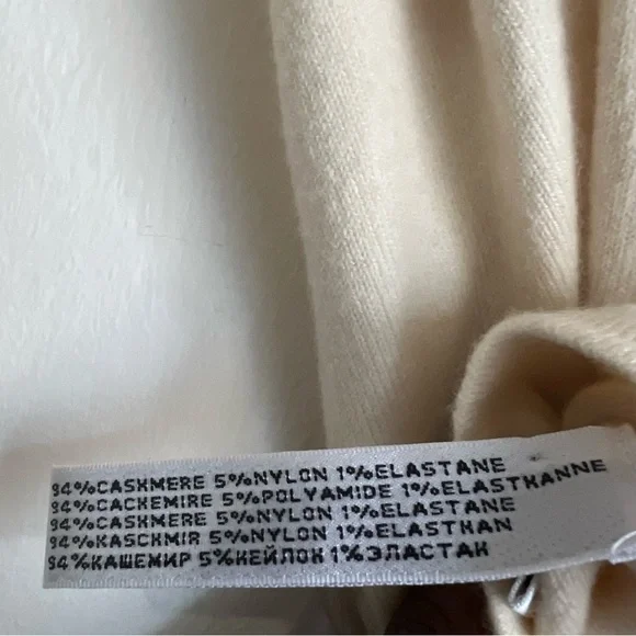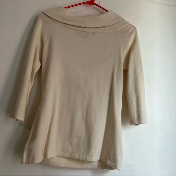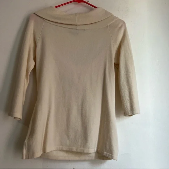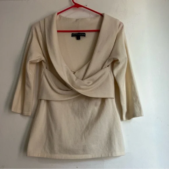 Pre owned Ralph Lauren Black Label Women's Ivory Cashmere Faux Wrap Sweater Blouse Large In excellent good used condition with no signs of any flaws to report. See pictures for details Very soft quarter sleeve cashmere sweater Ralph LaurenBlack Label Sweater Women's Size LPit to Pit 18"Length 24"Cashmere Blend-Gray-Faux Wrap-Cowl Neck-3/4 Sleeves94% cashmere, 5% nylon,1% elastane