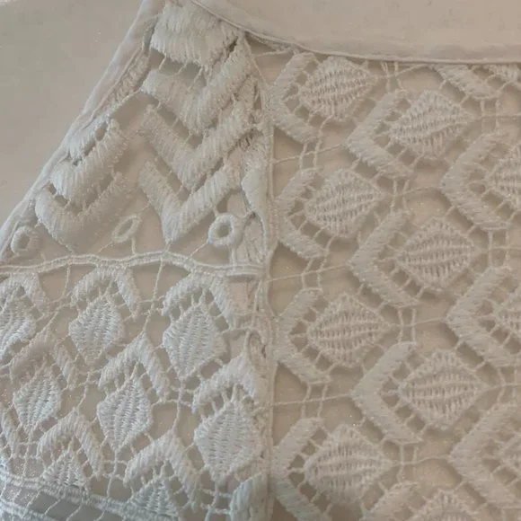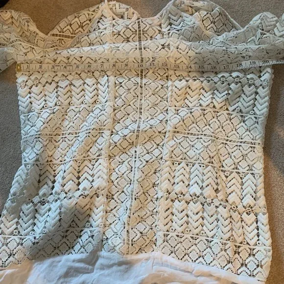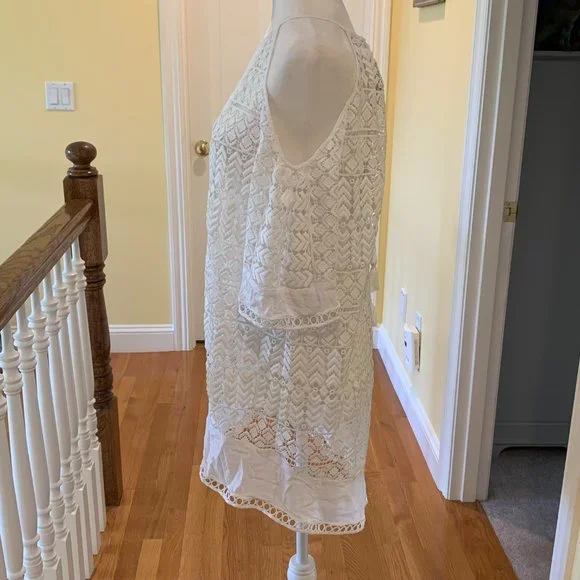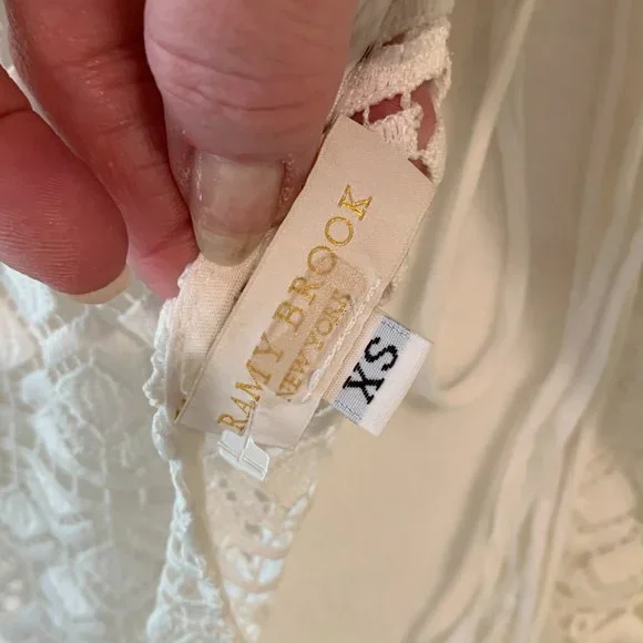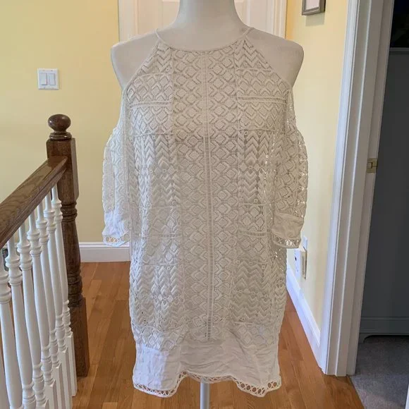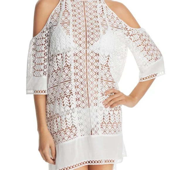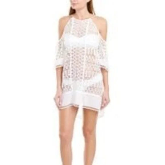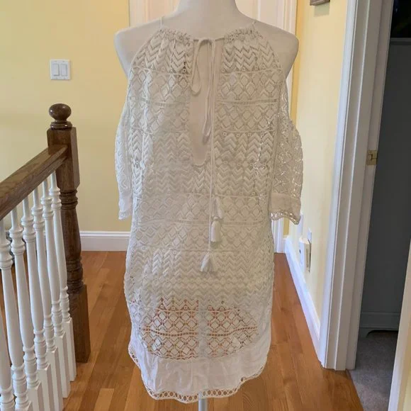 Ramy Brook Silas Cold Shoulder Lace Crochet Cover up Dress TopSize:XS (shown on size 6 mannequin)Color:WhiteLength = ~30" shoulder to hemTies at back of neck; three tassels on tiesCotton panelsCrochet has never looked cooler. Elevate your cover-up game with this white hot RAMY BROOK cold shoulder dress.Great preowned condition!