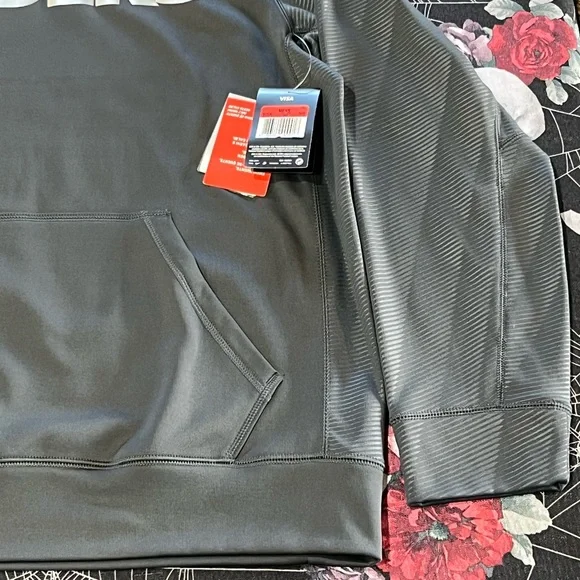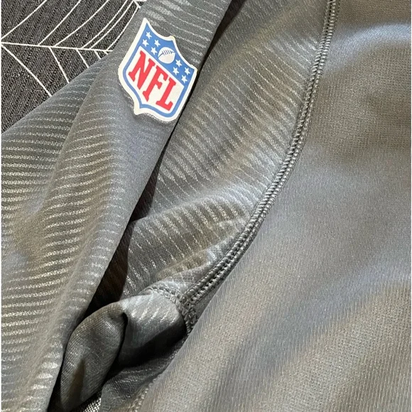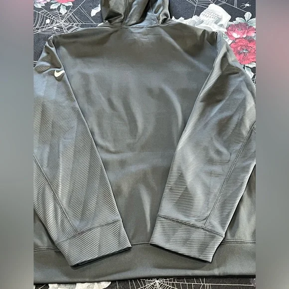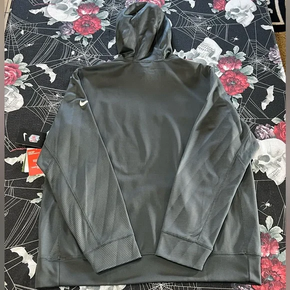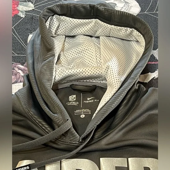 Extremely Rare, 2012 Nike Therma-Fit Grey/Silver "PLATINUM KO", LAS VEGAS “OAKLAND” RAIDERS performance SWEATSHIRT HOODIE in size Mens LARGE. SOLD OUT FOR OVER 12 YEARS! Sweatshirt is 100% Polyester. 100% Authentic Nike. Absolutely pristine condition! Collected and had been stored in a Rubbermaid tub since 2012!!! Buy from a trusted seller who is committed to customer service and very fast shipping. Thank you for looking, God Bless.