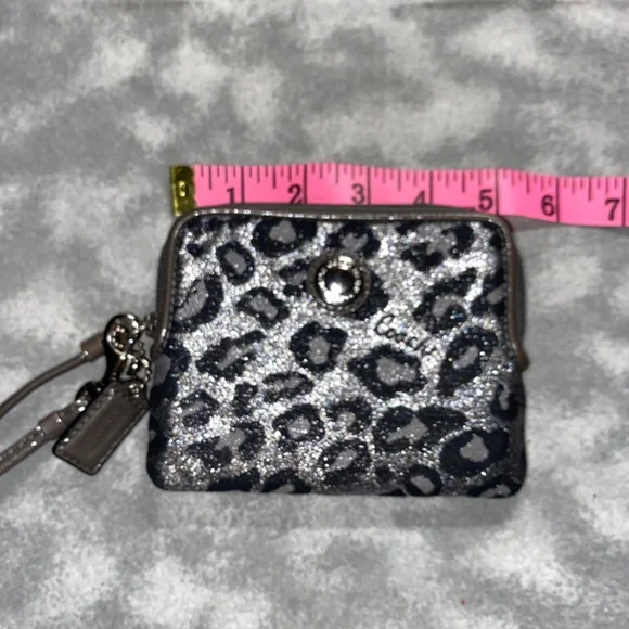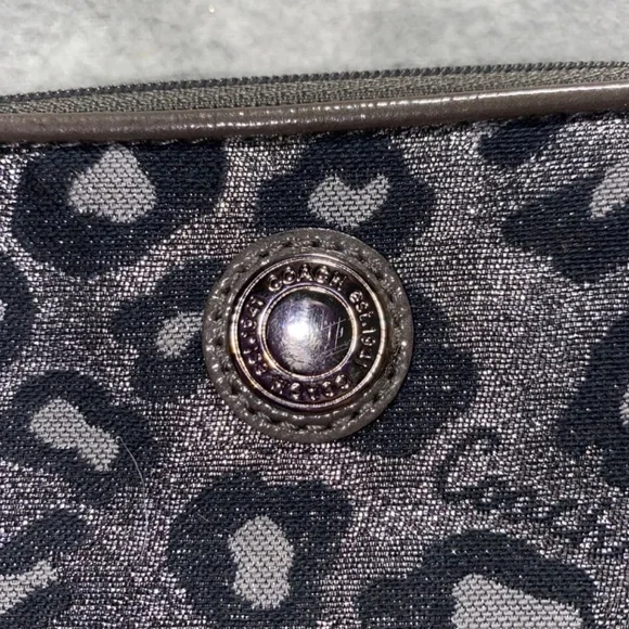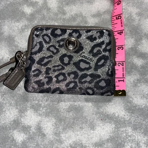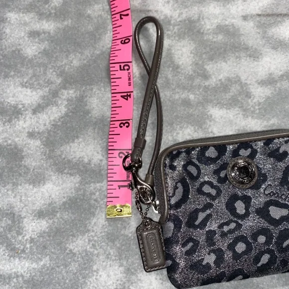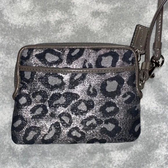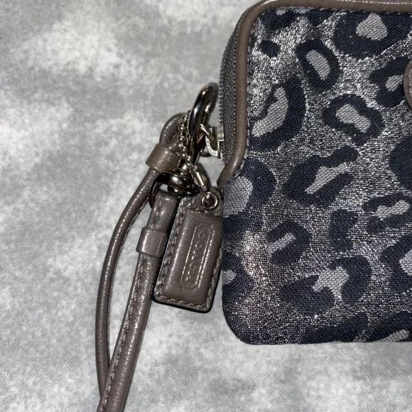 Step out in style with this stunning Coach Ocelot Print Wristlet, perfect for those on-the-go moments! Featuring a daring and bold ocelot print on signature Coach canvas, this wristlet is a true statement piece. Originally priced at $79, it's now available for a steal. The compact design fits your essentials like cards, cash, and keys, making it the ultimate accessory for a night out or a casual day.Condition: Excellent Used Condition (EUC)Color: Grey, Black Ocelot PrintMaterial: Signature Coach Canvas with Leather TrimMeasurements: Approximately 4.5" H x 6.5" WFeatures: Zip closure, fabric lining, two credit card slotsStrap: Detachable wrist strap for versatile wearAdd this exotic Coach wristlet to your collection and enjoy the perfect blend of fashion and function. Don't miss out on this rare item—grab it before it's gone!Shipping: Fast and secure shipping available. Check my closet for more fabulous finds!