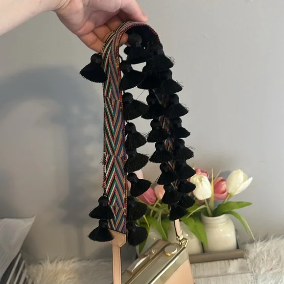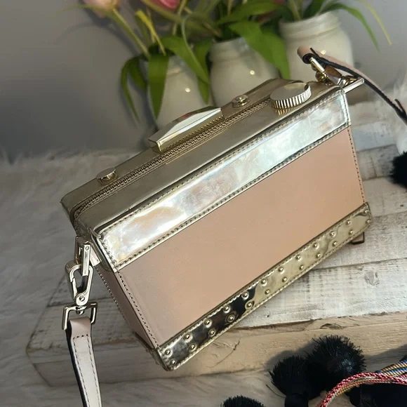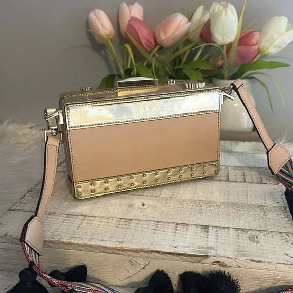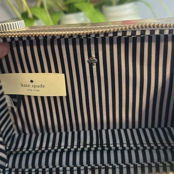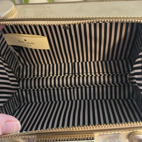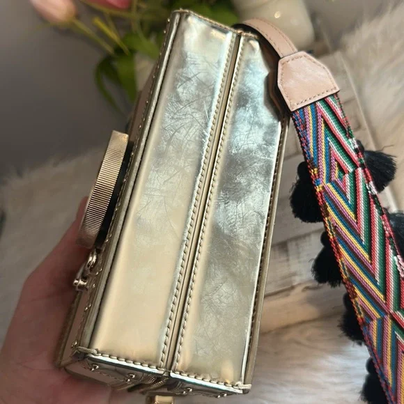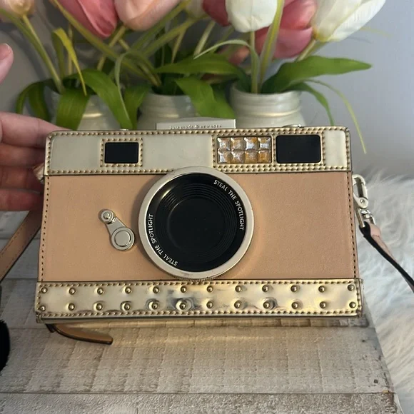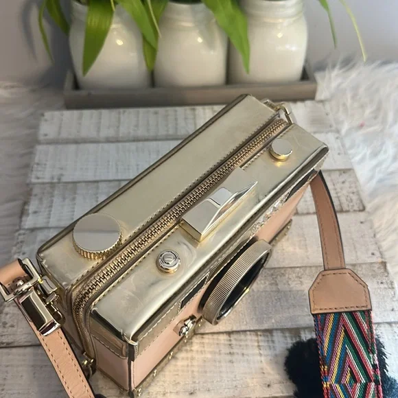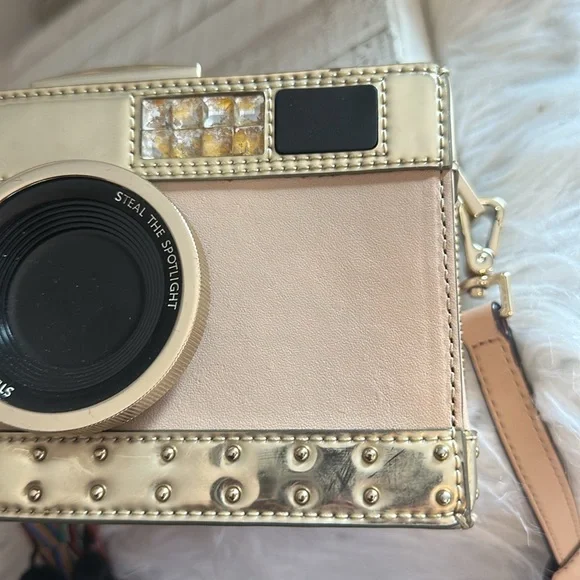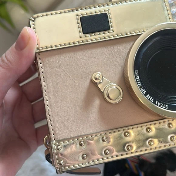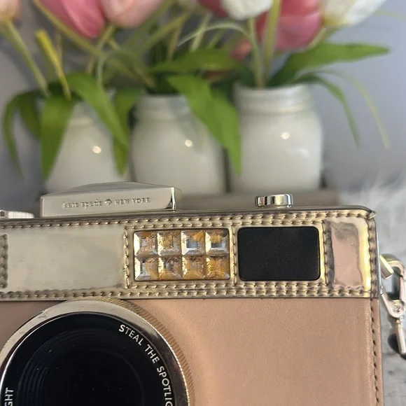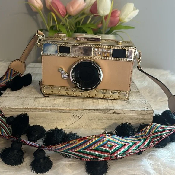 Very rare Kate spade spice things up camera crossbody with fun tassel strap. This bag is hard to find and a great collector piece. Shows some signs of age. The rhinestones of the lens have started to yellow due to age, which seems to happen to most of these camera bags. The gold top and bottom get a foggy look, shown in photos. There are a few small wrinkles and marks on exterior if inspecting closely. Interior looks clean. Overall the bag has held up well over time. Please look closely at pictures.