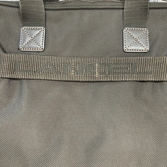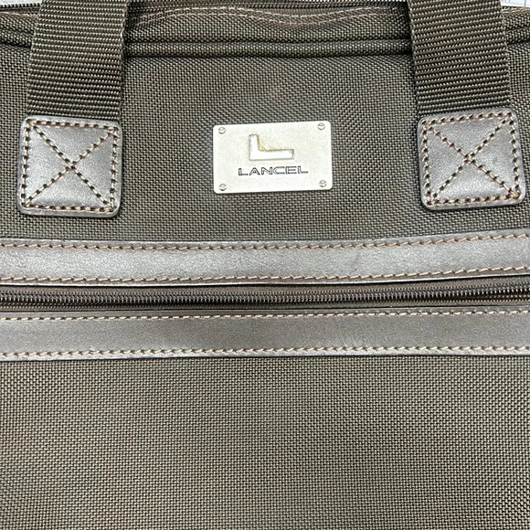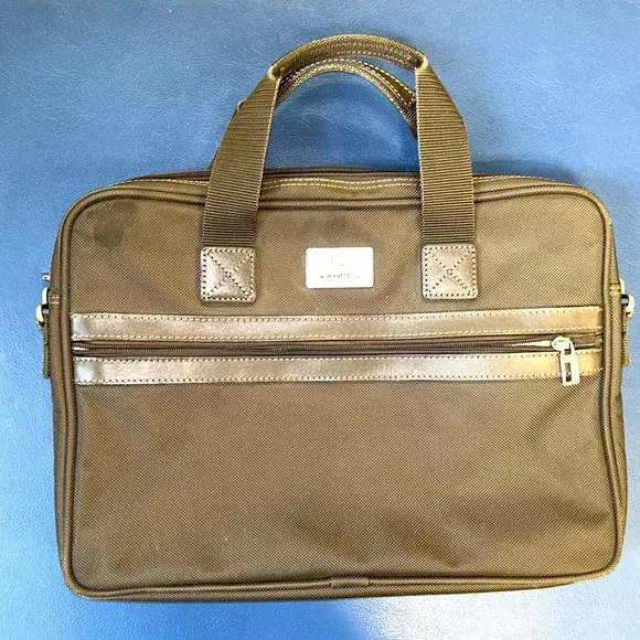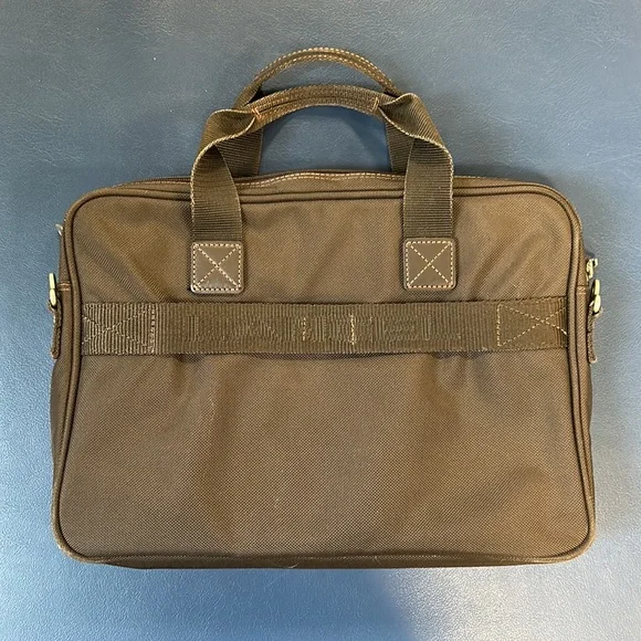 Measurements are approximate!! measures approximately 15 inches across and 11 inches high and 2 inches deep. Brand new interior appears to have never been used although there was a small spot in one corner not terribly noticeable. I have another men’s Lancel briefcase in tan that is available as well. These retail for $700! Ballistic nylon with leather trim and heavy duty hardware! Comes with a shoulder strap, which is not original.