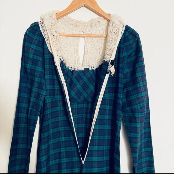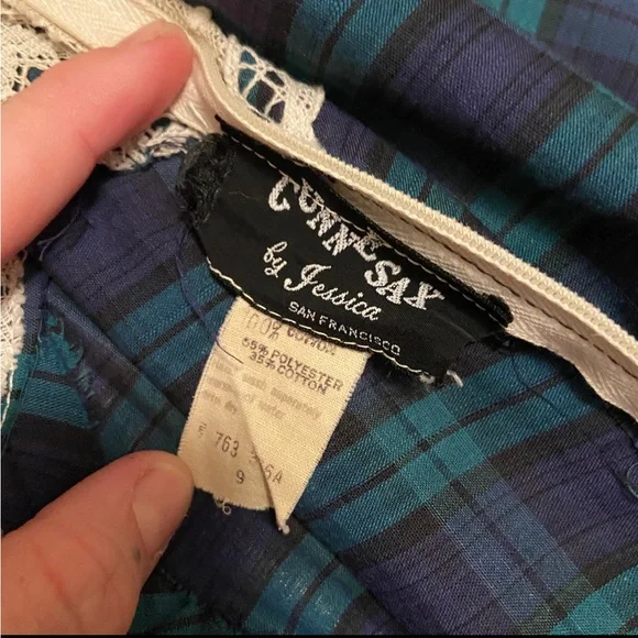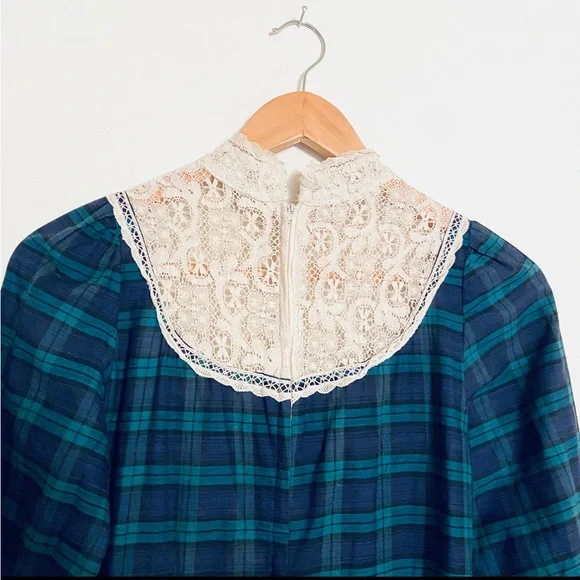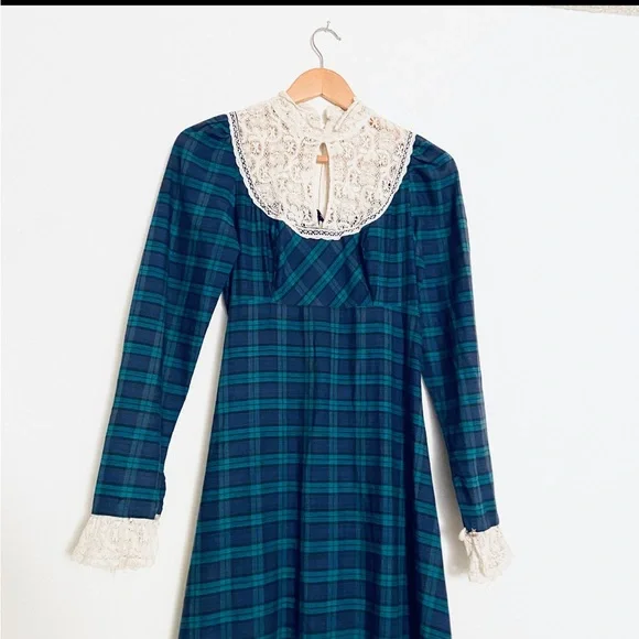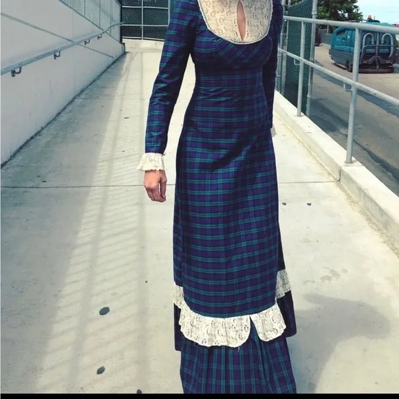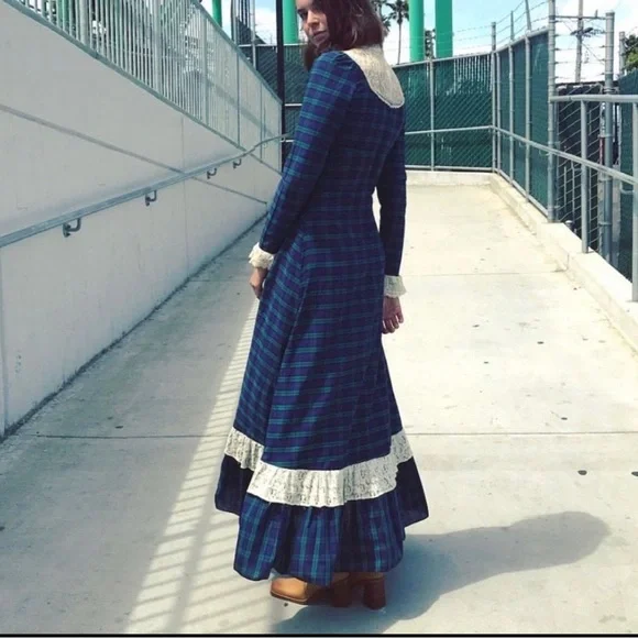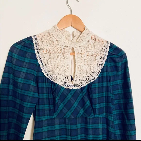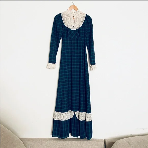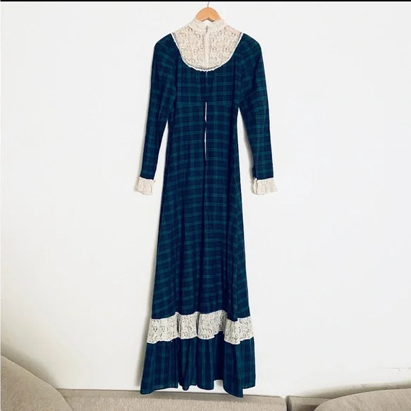 . High neckline, white crochet lace detail with keyhole. Long sleeves with lace ruffle. Full length skirt with ruffle hem. Zip closure down back with hook and eye at back of neck, unlined.Amazing vintage condition, structurally sound and ready to wear. Underarm of left side has a small area that has been mended. Due to age and delicate nature of fabric, standard signs of age are to be expected. Any flaws will be noted in description or photos, please view all before purchase. Listed size 9, best fit size 4Bust flat 17"Waist flat 14"Hips flat 20"Sleeve length 18"full length 59"