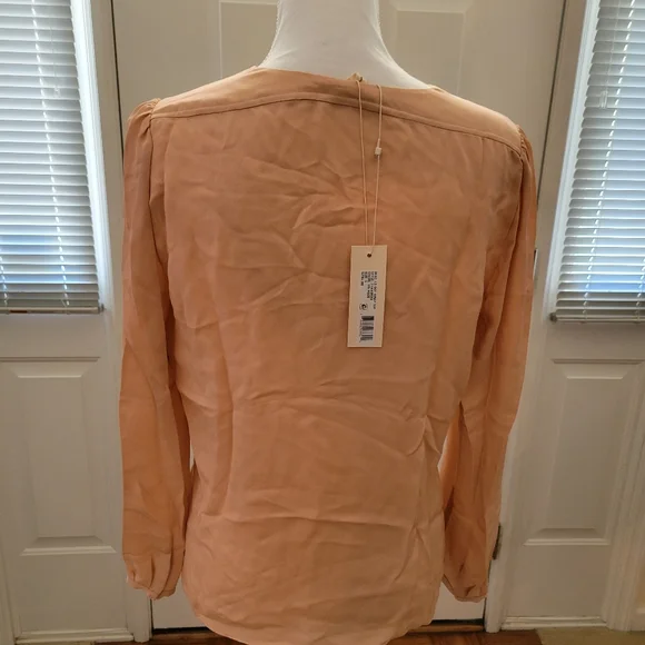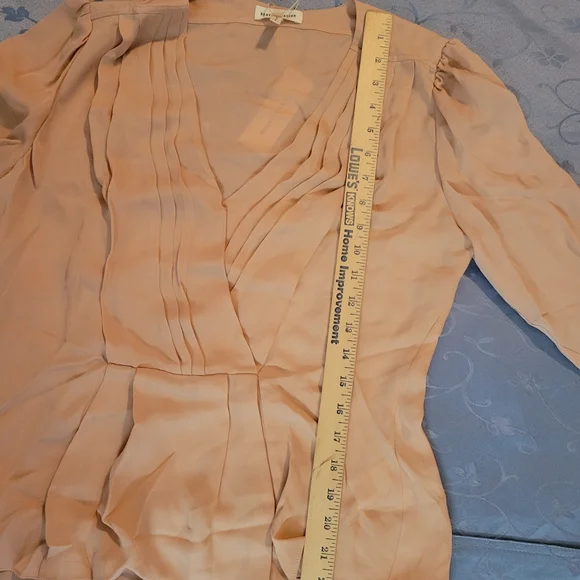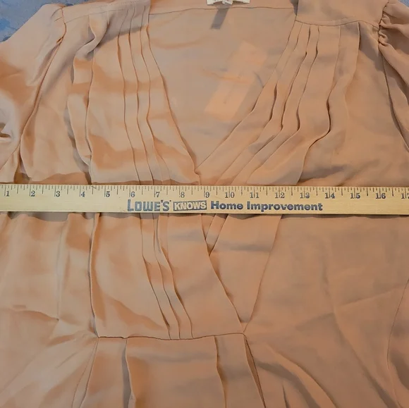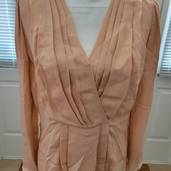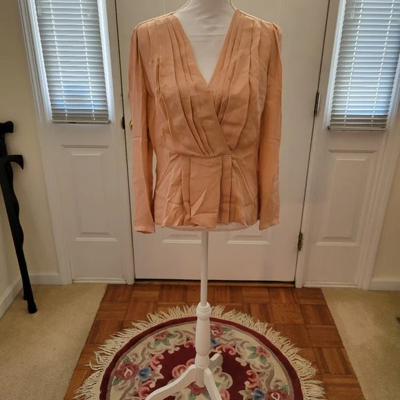 Rebecca Taylor Pleated Georgette Faux Wrap Blouse Top NWT Retail $295 Size 6Color NudeThis silk georgette blouse features a surplice neckline with pleating detailing, subtlepuff sleeves and a loose peplum hem100% SilkMeasurements in listingShipping informationI ship on Tuesday and Fridays.Items paid for by Monday night 5pm est will go out TuesdayItems paid for by Thursday night 5pm est will go out Friday