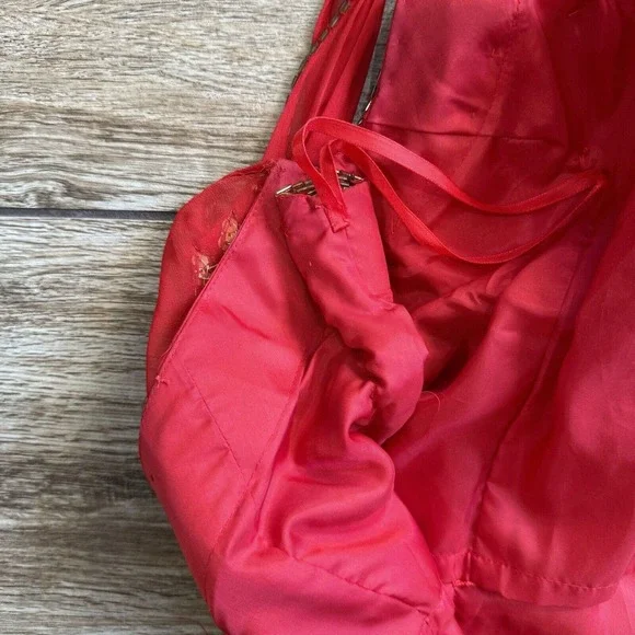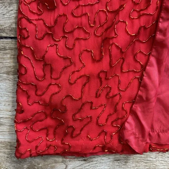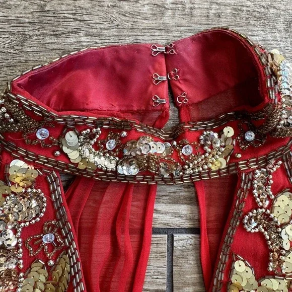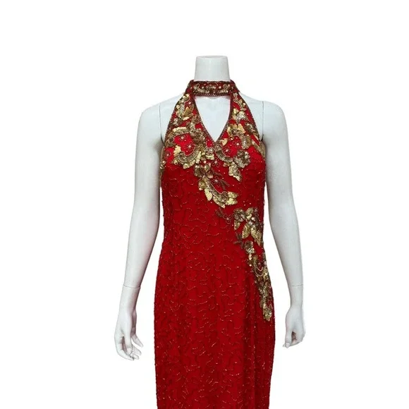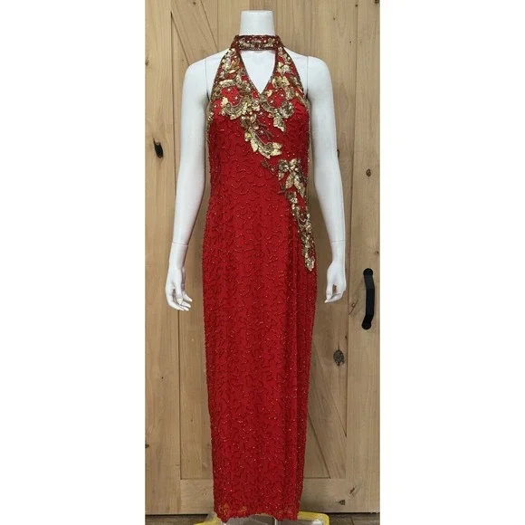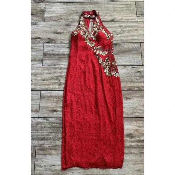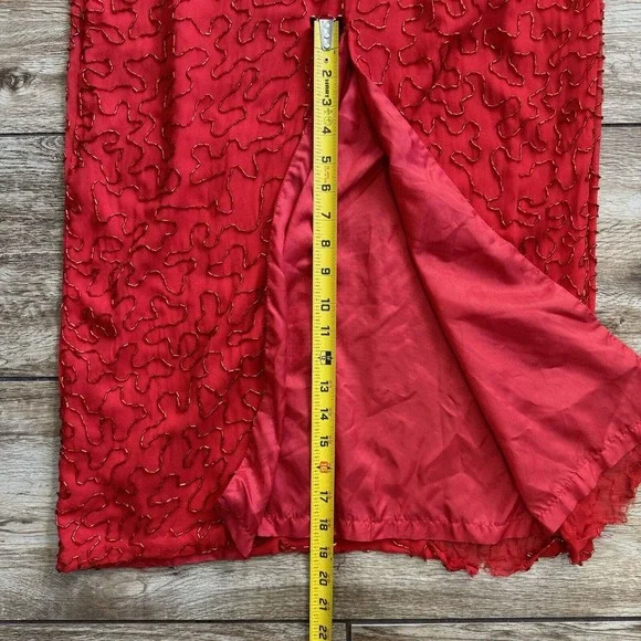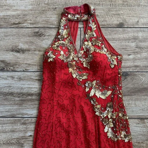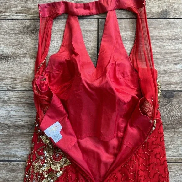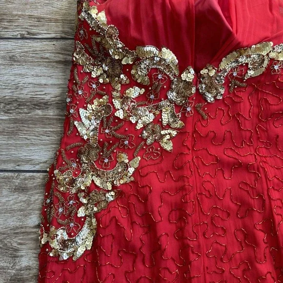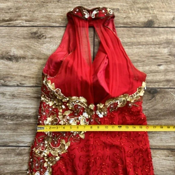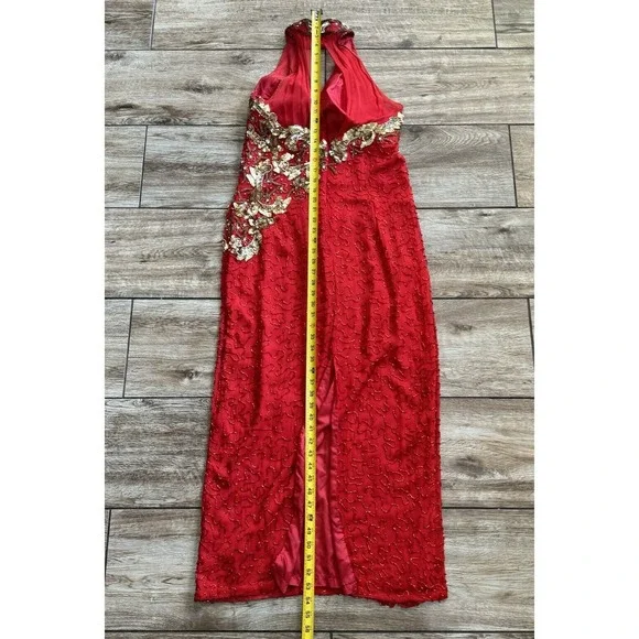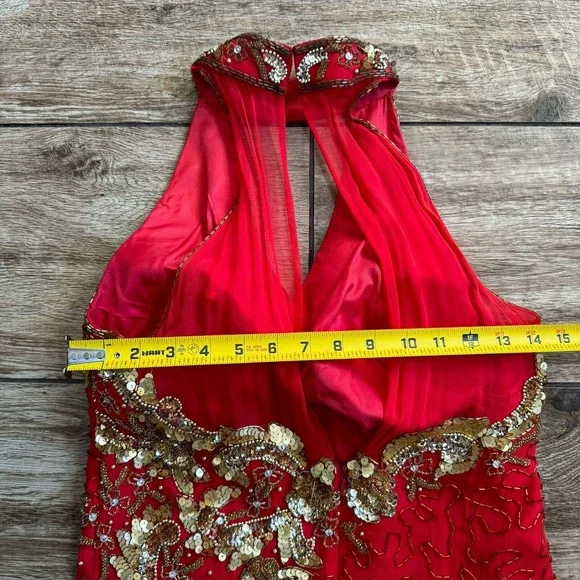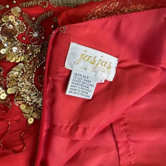 PICTURES SERVE AS PART OF THE DESCRIPTION.To ensure a perfect fit, please refer to measurements in the photos and compare measurements to an item you already own that fits you well. Sizes vary brand to brand.Red Gold Sequin Bead Floral Sequin Long 14 Prom Evening Gown Jasjas Designs SilkVery minor flaws in the sequins / loose threads. Part of hem is loose (see photo - it's still in attached, you really can't tell once the dress is on). Pre-owned Beautiful dressPLEASE READ BEFORE PURCHASING ITEMS---------------------------------------- * Items listed as “pre-owned” are used and have been worn, played with, assembled, etc. Please expect a normal amount of “gentle wear” unless otherwise stated. * SMOKE/PET FREE ENVIRONMENT * Photos are part of the description and may include measurements. The colors of the photos may vary slightly from actual color due to camera & computer screens. * Please ask questions before purchasing. * NO RETURNS: All sales are final. Check measurements and ask questions before purchasing.