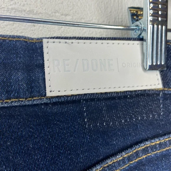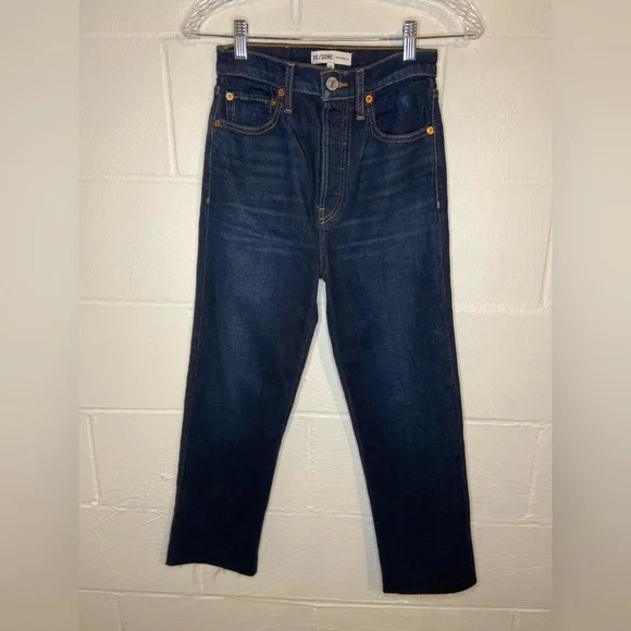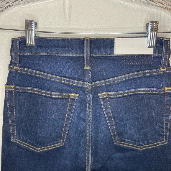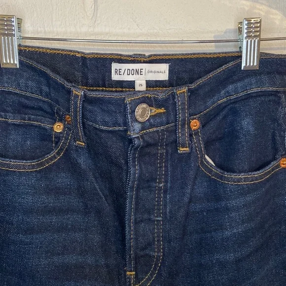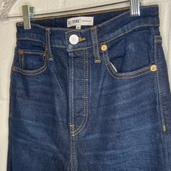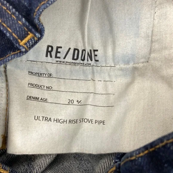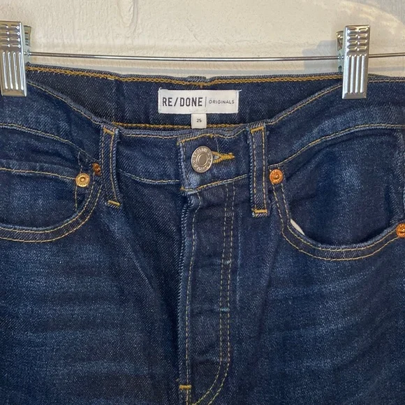 ❌ Preloved excellent condition no flaws noted, REDONE Ultra High Rise Stove Pipe Blue Jeans Raw hem comfort stretch denim, a classic button fly, and a cut off hem. Women’s size 25The 70s Stove Pipe in Dark Rinse Wash ( barley worn )Approx measurements:Waist 13” Inches Rise 12 “ Inches Inseam 25” Inches Length 36” Inches
