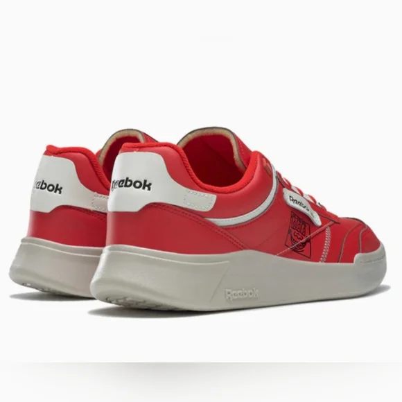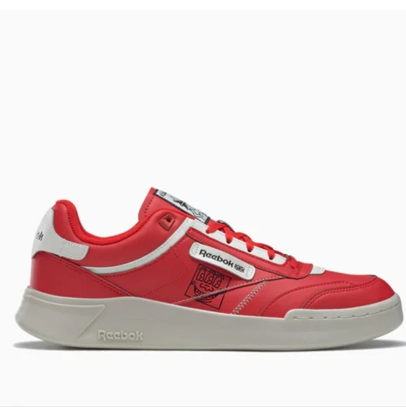 Club C Legacy "Three-Eyed Smiling Face" is a shoe that is part of a five-piece footwear collection celebrating the iconic street artist. The shoe features a smooth red leather upper with graphic depictions of Haring's three-eyed smiling face on the lateral quarter panel. Reebok branding is featured on the heel tab and the tongue tag, while the artist's signature is scrawled on the custom sockliner. The vivid scarlet hue is countered by a rubber cupsole in a neutral grey finish. This shoe is perfect for any fan of Keith Haring or street art!