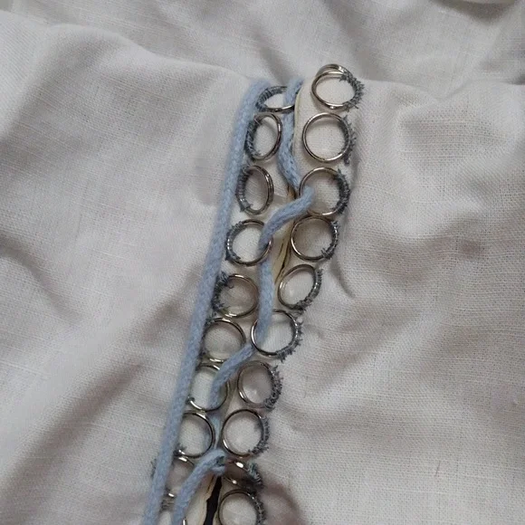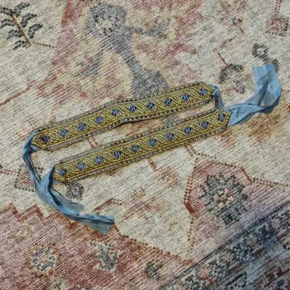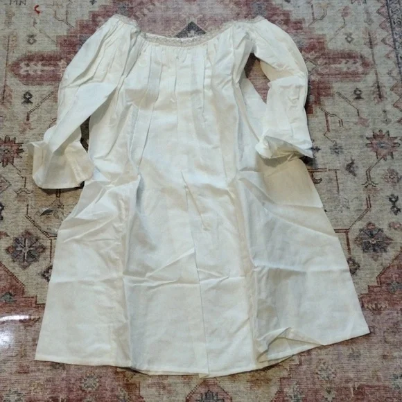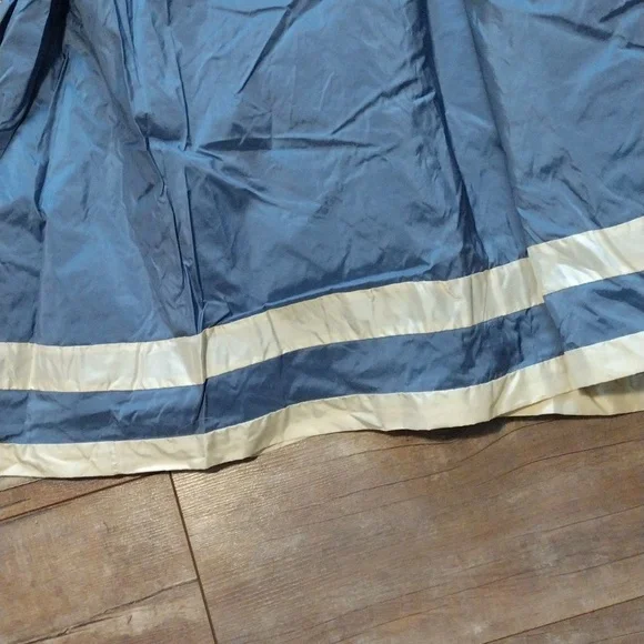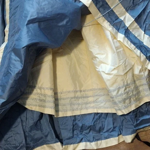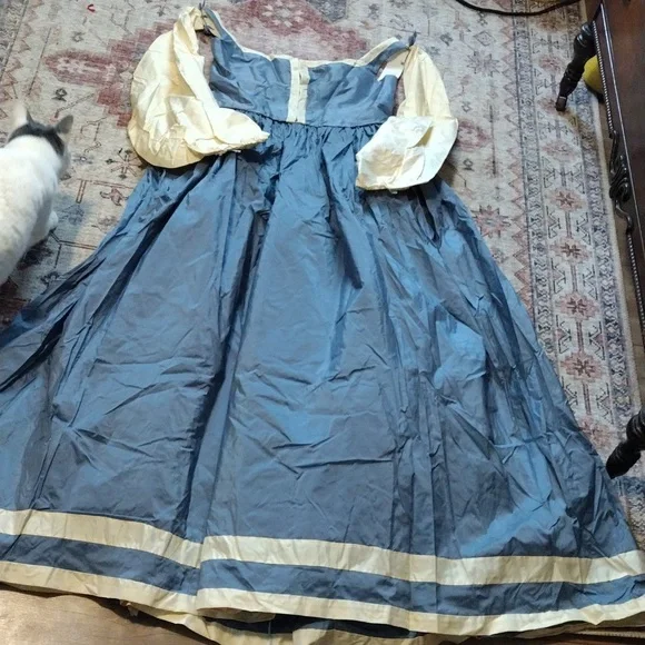 made by me. French blue and cream silk taffeta gown from a 16th century Florentine Gown pattern. dress has cream silk petticoat with silver trim sewn into the dress for extra volume in the skirt. detachable cream sleeves tied into place with silk ribbons and hand stitched holes. comes with linen chemise with gold metallic trim and an additional cotton chemise, plain with no trim. comes with garters. metallic and silk ribbons. best for a 40 inch bust and 30 inch waist but the bodice laces up and can accommodate a larger bust and waist. made for a 5' 4" tall figure. can send more measurements up on request I'm selling this at my cost to make and even with 's take,I'm selling this at a loss. factoring in my labor, this is a $1,000 gown! there is a lot of hand sewing on this gown and it's never been worn.