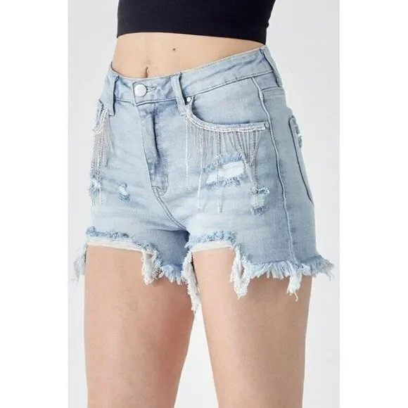 Risen Light Wash High Rise Rhinestone Diamond Western Shorts S-XL RDS6046High rise women's rhinestone fringe pocket distressed light wash denim shorts run true to size and have great stretch. These medium wash denim shorts have five pockets and raw hem. Model is 5'8" 34-24-36 wearing a size small.Light Denim Wash High Rise Distressed Denim Cut Off/Raw Hem Belt LoopsZipper & Button Closure5 Pockets 10" Rise & 3" Inseam Amazing Fitting Shorts/Very Stretchy 92% Cotton 6% Polyester 2% SpandexRuns True to Size Size Chart: Small 0/2/4 or 3/5Medium 4/6/8 or 7/9Large 8/10/12 or 11/13XL 13/15Brand: Risen
