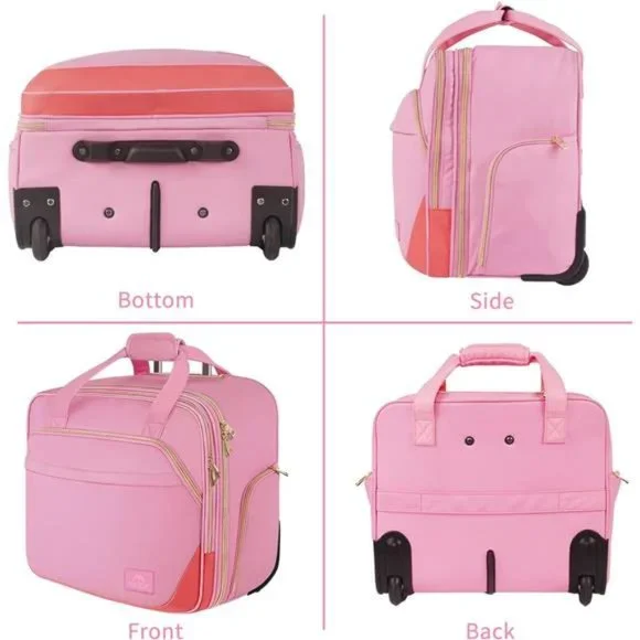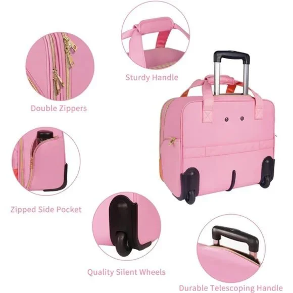 🧿【LARGE CAPACITY】Designed with wide open main compartment and laptop compartment, The rolling laptop bag is easy to store your laptop, clothes, books, paperwork, files, and all your daily necessities for your overnight travel. The two front pockets provide great organizers for your wallet, cards, and other small items. The zippered pocket at each side is designed for your water bottle, umbrella. Every compartment keeps your items well organized for easy business trip, office work, overnight🧿【PROTECTION DESIGN】 Padded foam laptop compartment with hook and loop strap offers the secure independence space for your laptop from bumps and shocks keeps your computer in a stability station on your business trip. The durable feet on the front is easy to stop the rolling laptop bag from tipping over. Main compartment features two straps with buckle and hook & loop straps keep your daily items from falling out.🧿【TRAVEL FRIENDLY】 The large opening design makes quickly access to take in & out your daily things. The luggage strap on the back is designed to fit on the trolley of your luggage for your hand free, making your business travel more convenient. A great travel gift for women, ladies, mother, business worker.🧿【EASY TO CARRY】 Adjustable push-button telescoping handle extends 24 Inch to change as pull trolley case, allowing you to retract into a zippered pocket when not in use. Smooth silent wheels provide easy access to move on narrow walkways and tight corners.