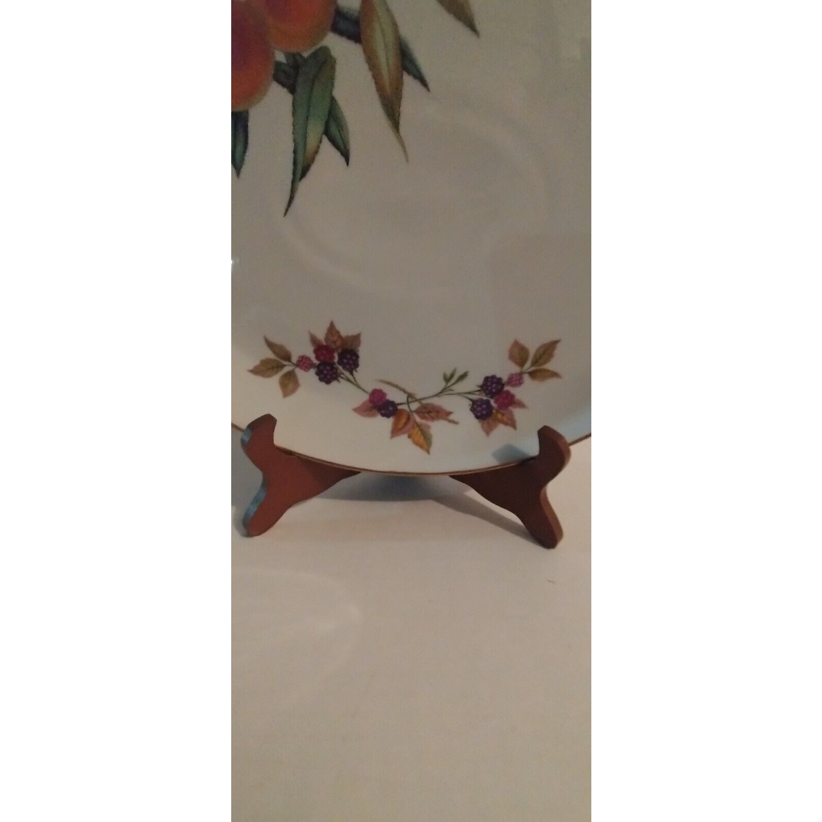 This Royal Worcester Evesham Gold 13" platter features a beautiful multicolor fruit theme, including peaches, raspberries, and blackberries. Made of high-quality porcelain, this vintage baking dish is a perfect addition to any collection. The rectangular shape and glossy finish make it a great choice for display or use.