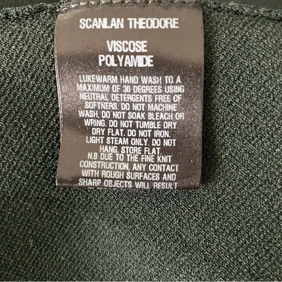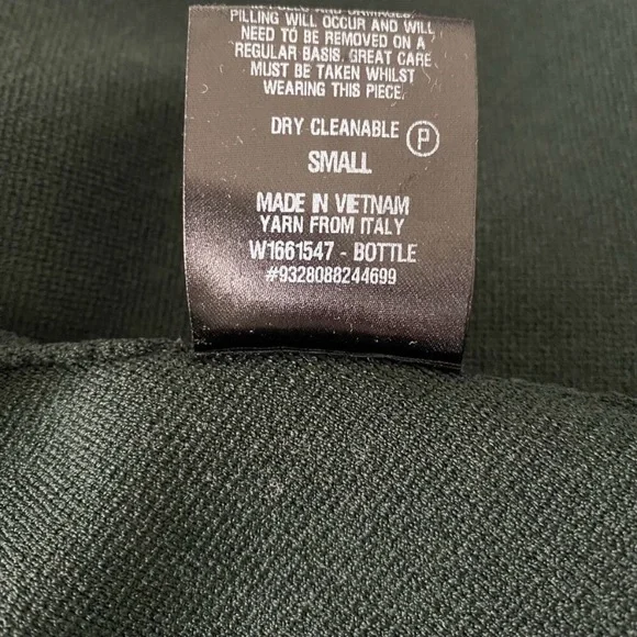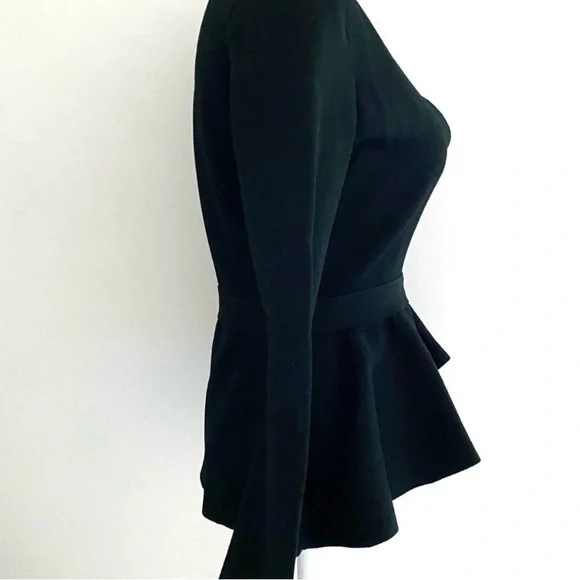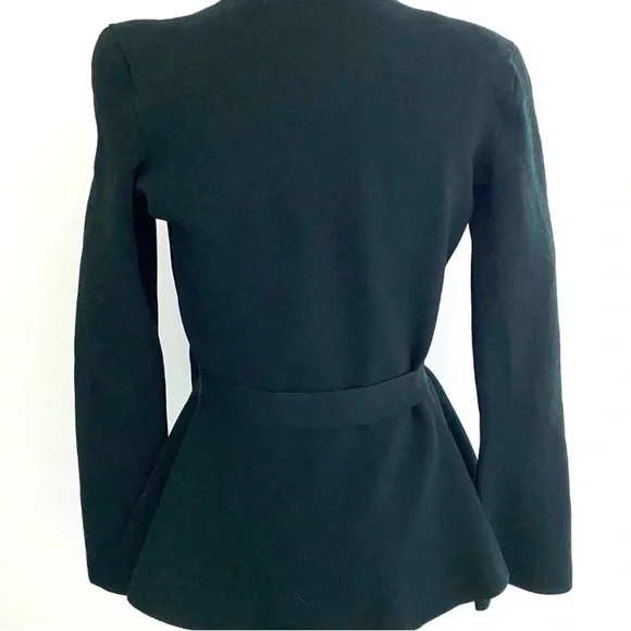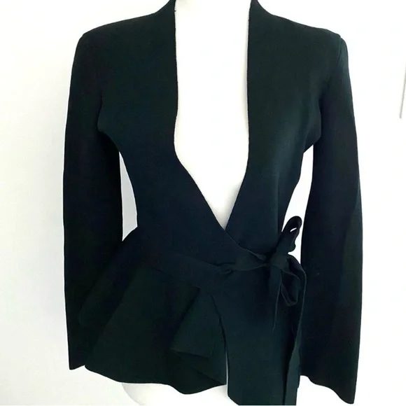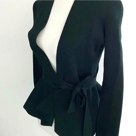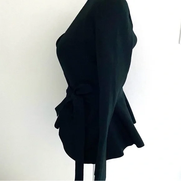 Features:Beautifully tailored crepe knit jacket from exclusive Australian designer Scanlan Theodore. Peplum wrap style that can be worn with the bow tied in the front or the back.Long sleeves with bell cuffs Open style with waist tie Peplum hem, falls to hip Comes with sewn in shoulder pads for a structured look Condition: In new condition, no holes, stains, odors or loose threads.SIZE & FIT About 24.5” from shoulder to hem Size: Small Color: Bottle Green (the top in the cover photo is black - for model purposes only) Material: Viscose/polyamide blend Dry Clean Only Imported of Italian yarn