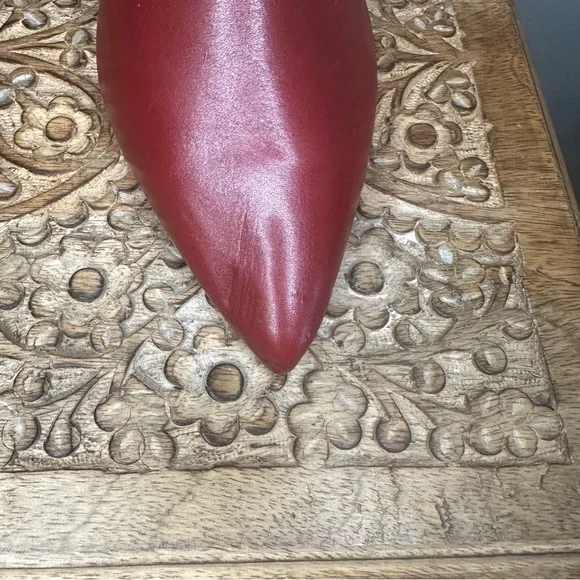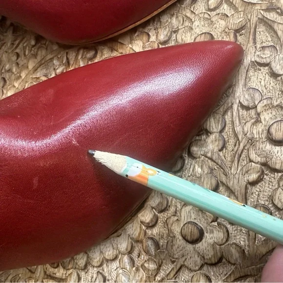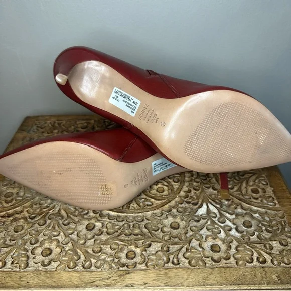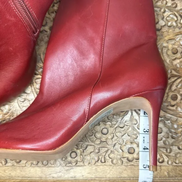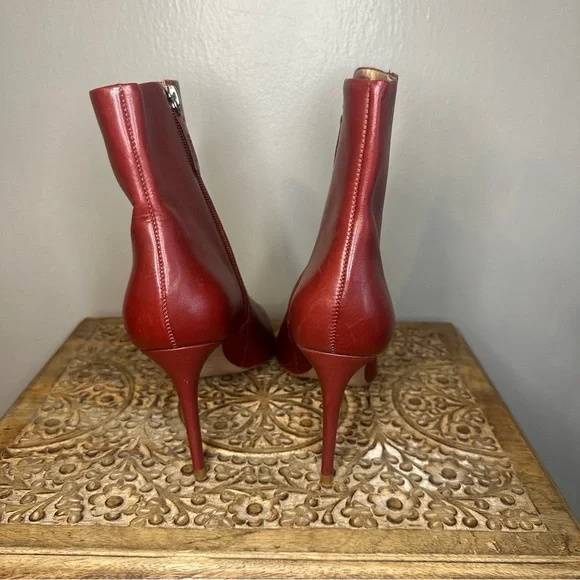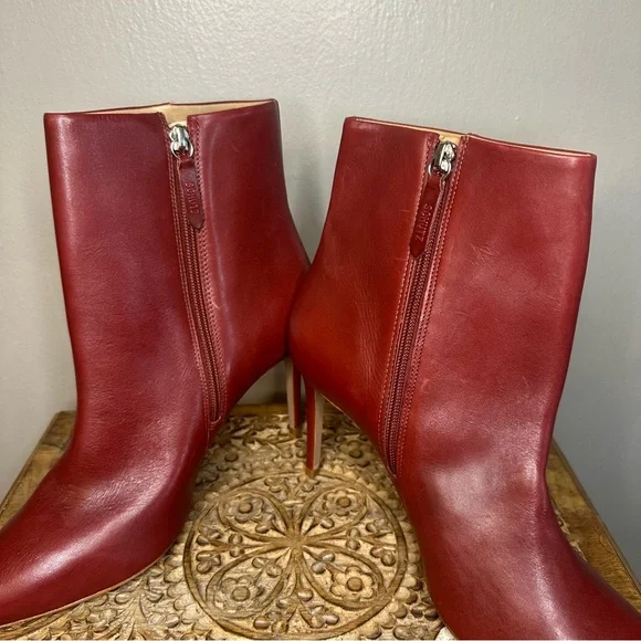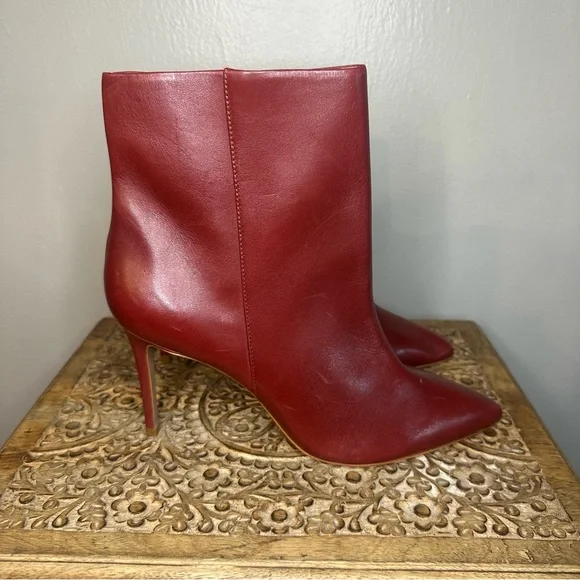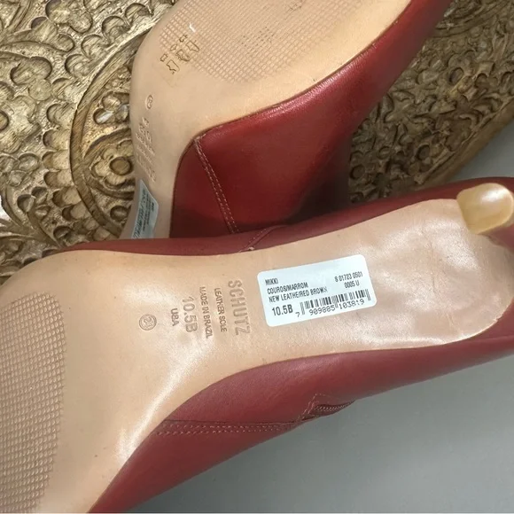 Schutz Women’s Mikki Mid Leather Pointed ToeBootie Red/Brown Sz 10.5 New without TagsFair Condition Crease in ToeMinor Leather ScuffsA pointy toe and tall, slender heel balance a sleek and sophisticated leather bootie with a side-zip closure for easy on-off.2 3/4" heel5" shaftInset side-zip closureLeather upper, lining and soleMade in Brazil