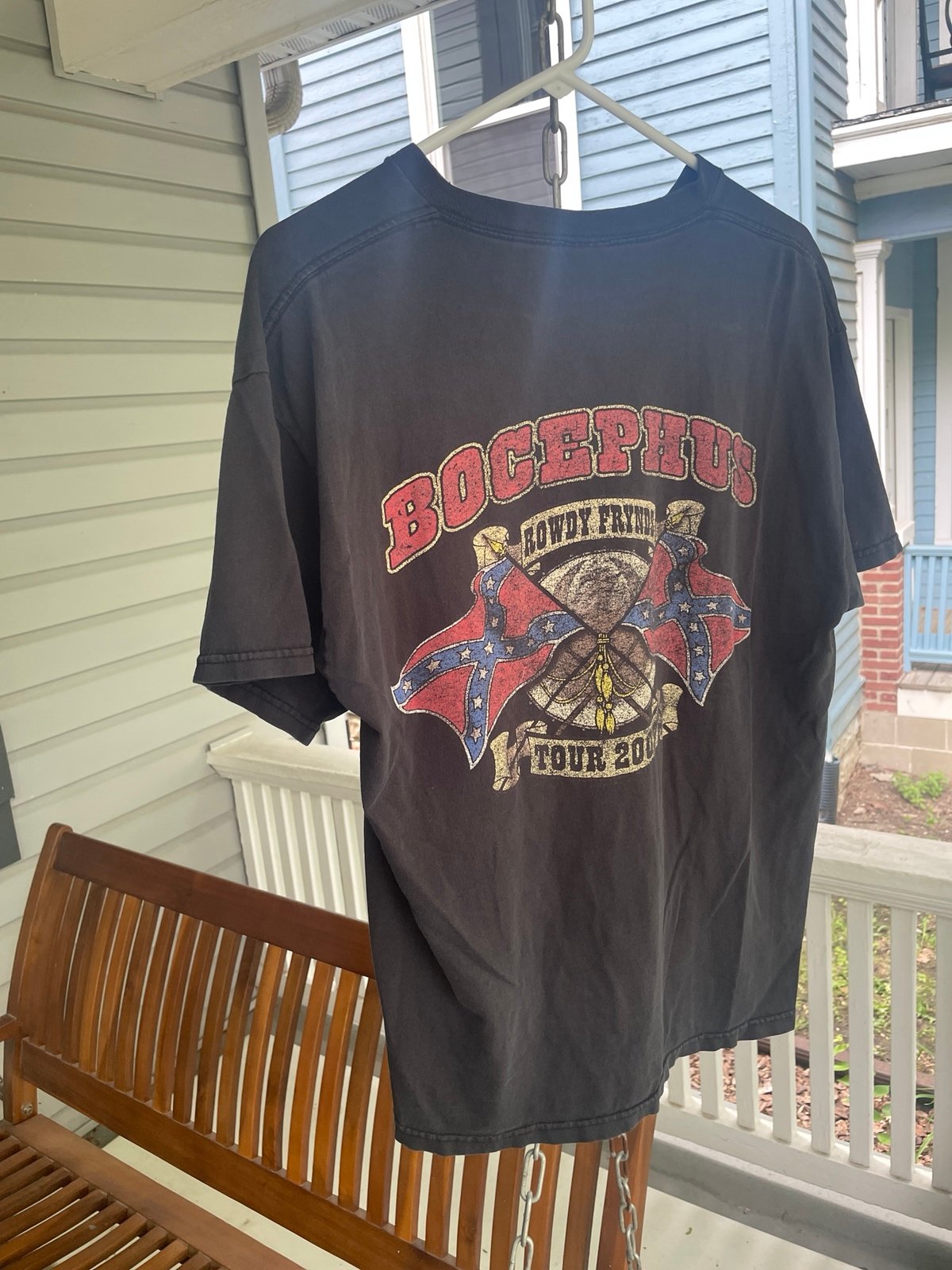 Very rare nostalgia, Hank Williams in concert beautiful T-shirt and gorgeous shape take all that racism stuff out of your head and if you need some understanding on that look at Kanye West is got the so bad racist Nazi flag on all his stuff. How come no one’s talking about that now how come News isn’t talking about that CNN ABCC all those how come that isn’t a big deal that Kanye West has the twisted cross the Nazi the German the hate symbol all over his clothes. Do you wanna know why because we all love each other and it’s all lies there’s very few people that have hate like that and the few that they are, they play them over and over and over and I’m so tired of it. I don’t wanna hear any more of it. Everyone loves each other and that’s the way it is in my head. So this is 2007 vintage. It sits a little smaller as a large. I would say it’s more like a men’s medium men’s large right in between those two but the distilled look it’s brand new looking in person. It’s just got t that kind
