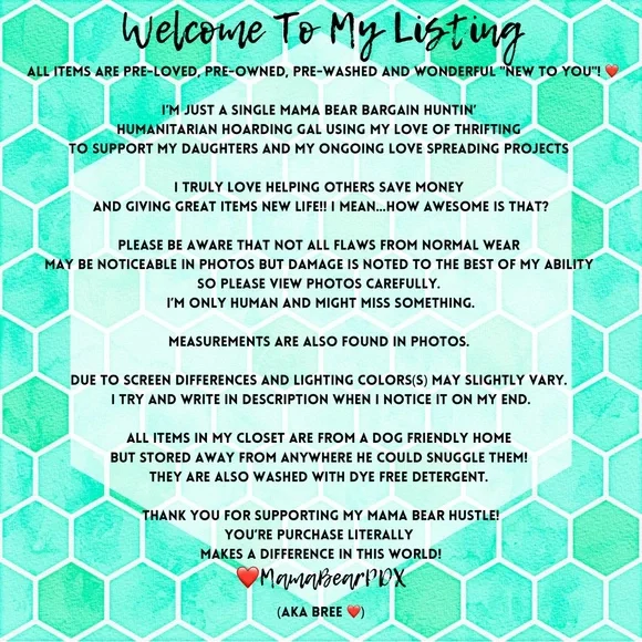 ❤️Thank You SO much for visiting my listing!❤️All items are pre-loved, pre-owned, pre-washed and wonderful "New To You"! ❤️I’m just a Single Mama Bear Bargain Huntin’ Humanitarian Hoarding Gal supporting my daughters while raising money for all my love spreading projects while helping others save money AND giving great items new life!! I always send offers to likes with discounted shipping! ❤️Bundle And Save Even More!!